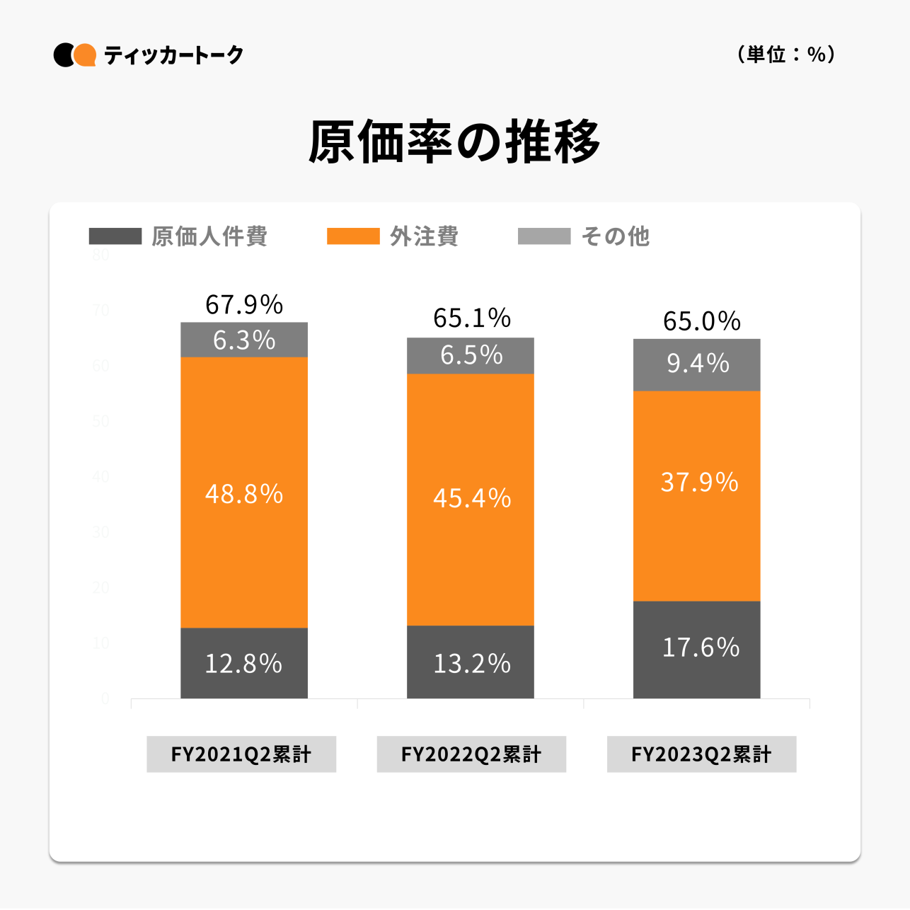 原価率は安定的に推移しています。売上構成比の変化に加え、グループ全体の内製化活動により外注比率が低下しました。 サーバーは大手クラウドサーバーを利用していますが、いずれもドル建てでの決済となっており、支払のタイミングの為替レートで支払いをしています。