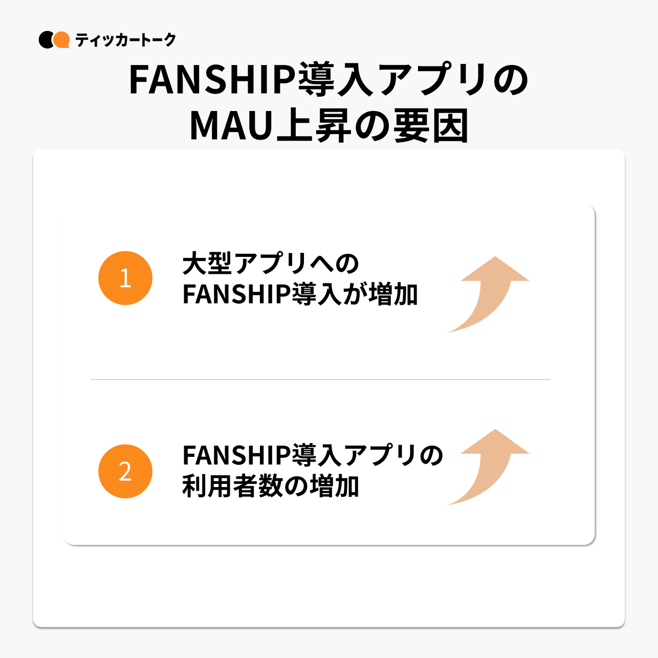 MAUの前年同期比が上昇している理由としては、大型アプリへのFANSHIP導入が進んでいることと、FANSHIP導入アプリの利用者数が増加したことによるものとなっています。