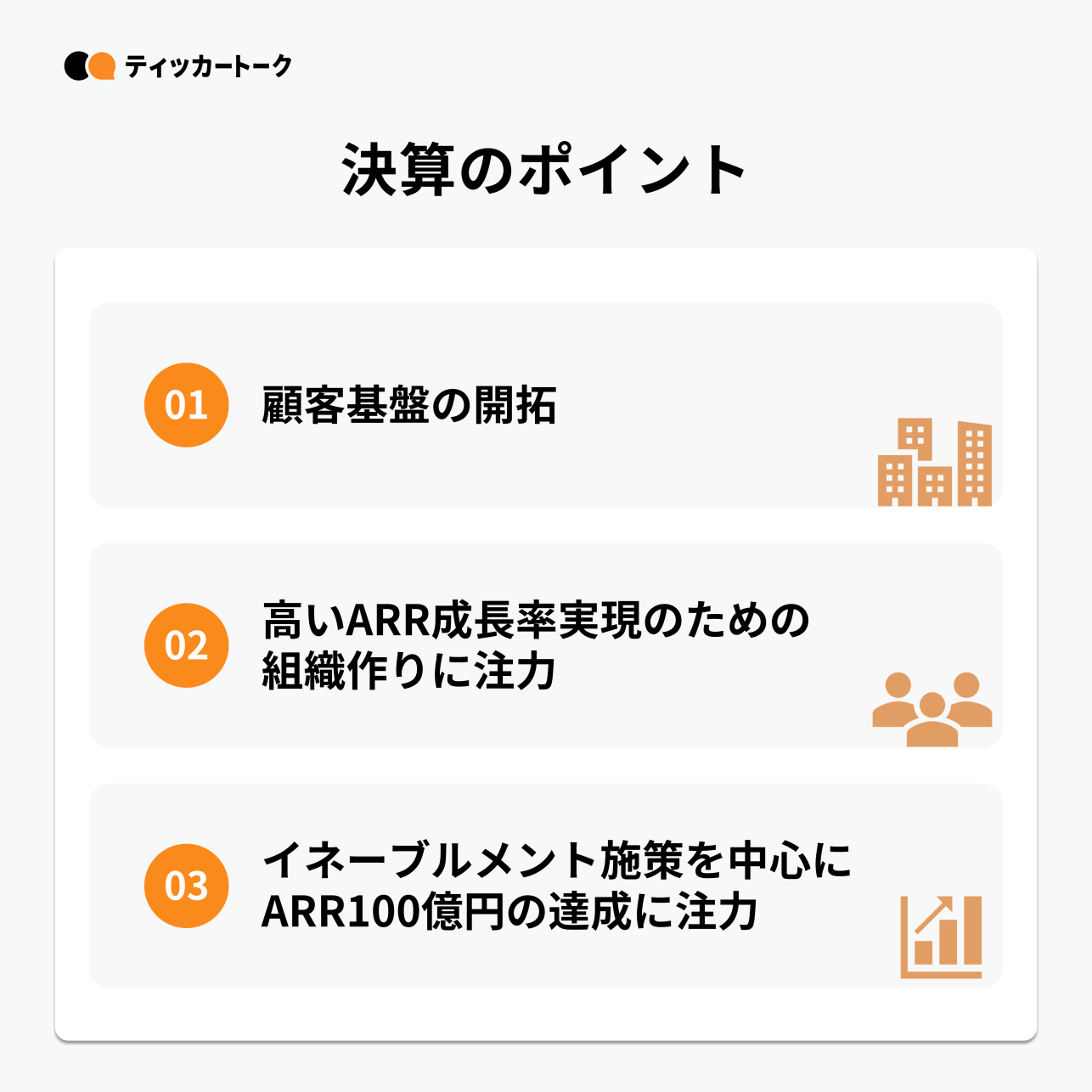 主に3点ありますまず将来のネットワーク効果を加速させる大手顧客の開拓等顧客基盤の構築が進みました次に先行投資については高いARR成長率の実現するためのプロダクトづくりと組織づくりに引き続き注力しております最後に事業についてはイネーブルメント施策を中心として中期KGIであるARR100億円の早期達成に向け進捗させています また今期の決算説明資料にて今後の建設市場の見通し建設DXを後押しする政策弊社の中期戦略を資料化しておりますのでそちらにもご注目いただければと思います