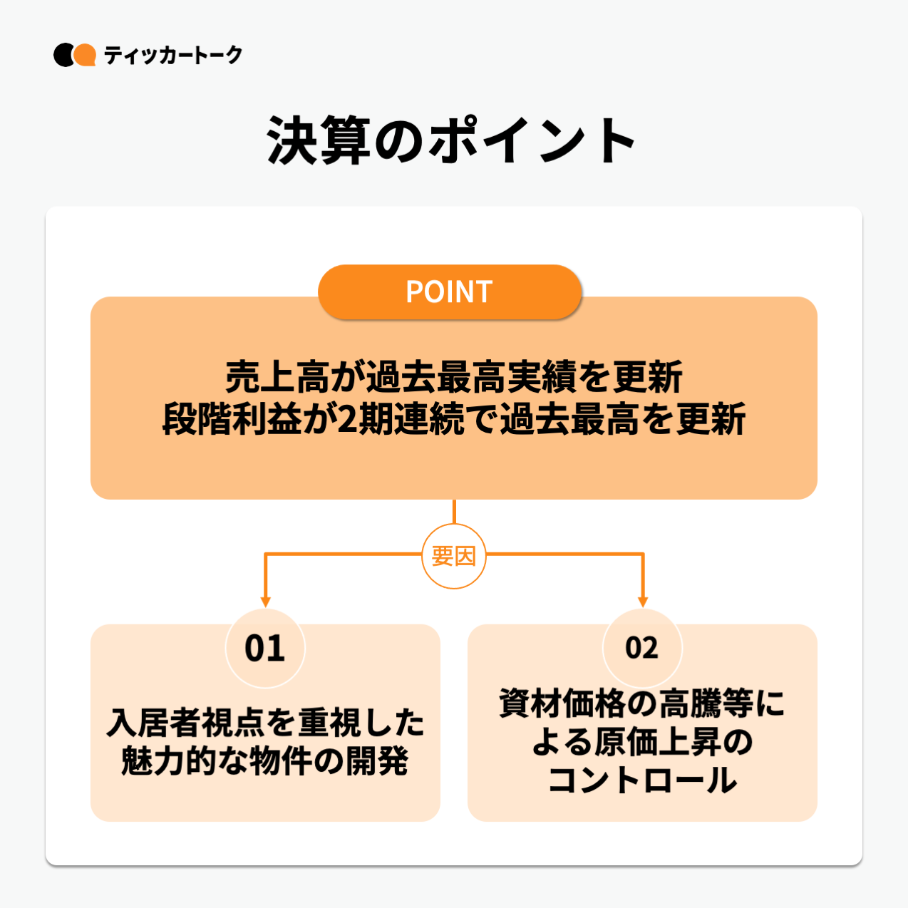 東京の人気エリアへの不動産投資需要が堅調に推移する中入居者視点を重視した魅力的な開発物件が高評価を受け販売が堅調に推移するとともに資材価格の高騰等による原価上昇を一定の範囲でコントロールできたことにより売上高は過去最高を更新段階利益は2期連続で過去最高を更新しました