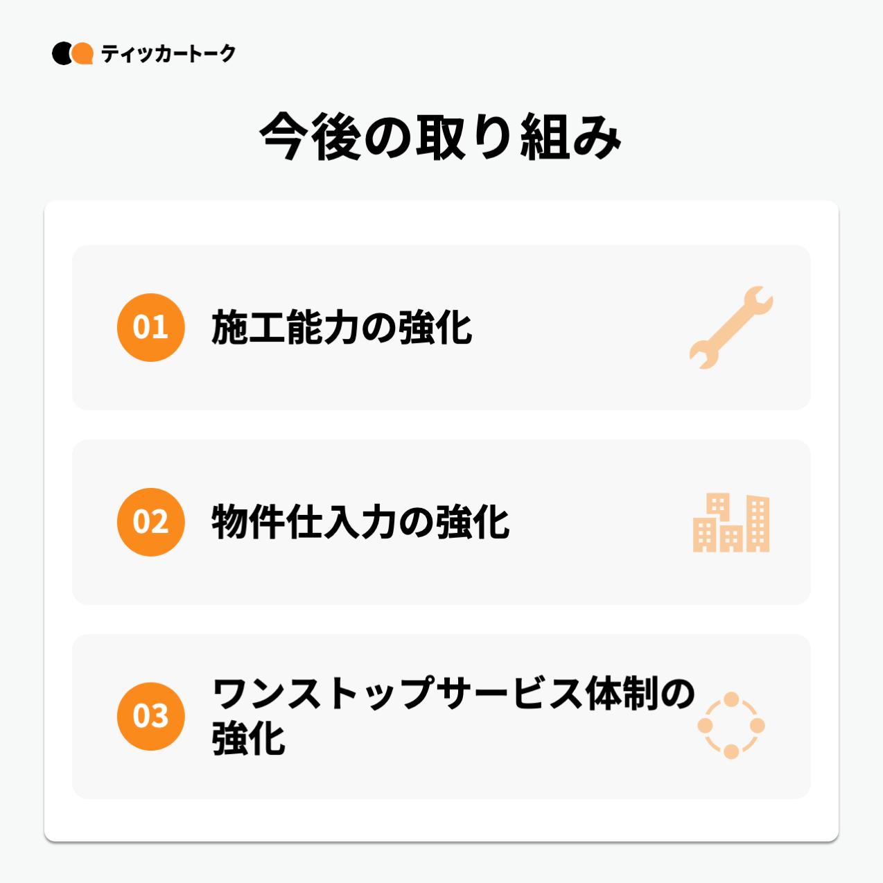 まず施工能力の強化が必要です岩本組の子会社化はその取り組みの一つです物件仕入力の強化も必要な取り組みの一つでありこちらは人員体制を増強していきます現時点で土地の仕入は順調に進められておりワンストップサービス体制の強化を推進することで大型物件開発は問題なく進められると考えています