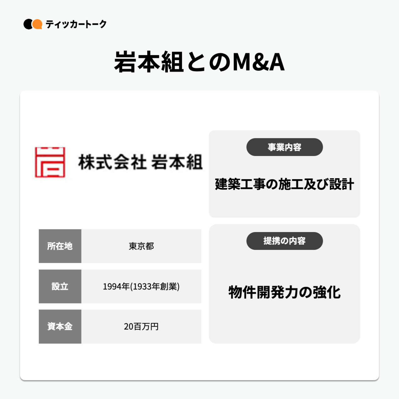 岩本組は創業から90年の歴史を持つゼネコンであり高い施工技術力が業界で評価され有名建築家が設計する物件の施工を数多く手がけてきた実績のある会社です当社が開発する物件と同じRC鉄筋コンクリートの物件を数多く手がける同社を子会社化することにより高い技術力を持った施工能力を増強し物件開発力を強化できます