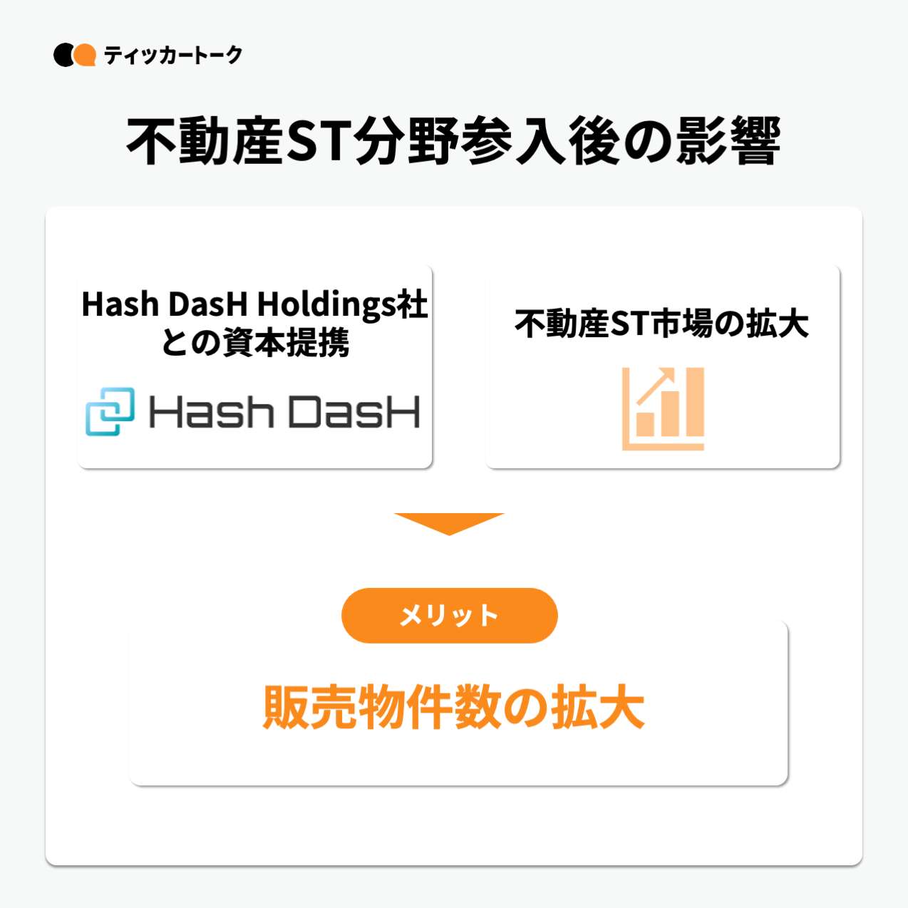 Hash DasH Holdings社との資本提携により参入する不動産ST分野のビジネスモデルにおいて当社が担う役割は不動産ST商品を組成するために優良な物件を提供することです従来から行っている投資用不動産の販売先のひとつがHash DasH Holdings不動産ST組成になるということですので現時点で既存事業への大きな影響はありません今後不動産STの市場が拡大すると同社に販売する物件数が増えていくことになります