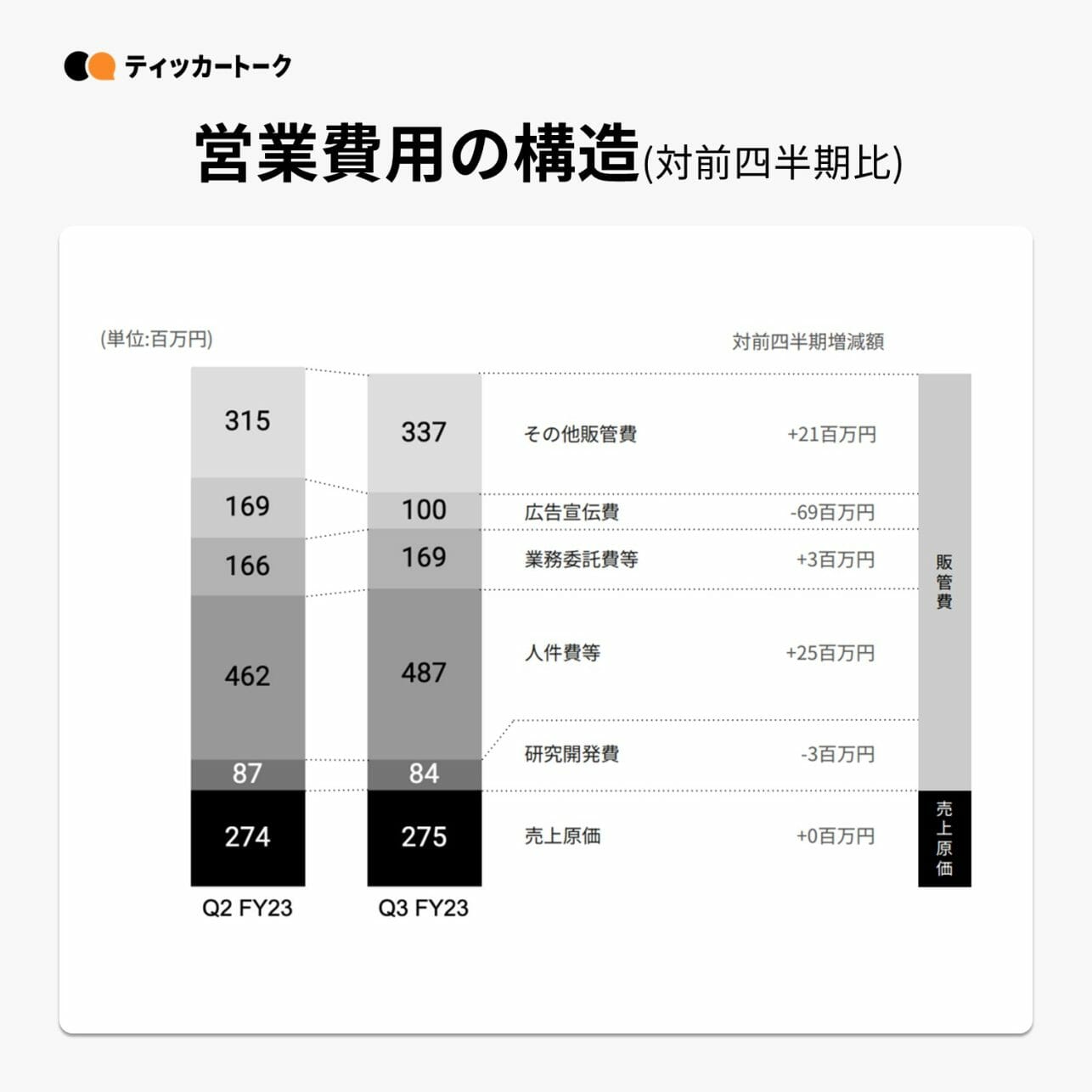 当四半期においても多様なイベントやセミナーへの出展や登壇をするなど、積極的な活動を実施しましたが、前四半期とは手法が異なったため、対前四半期で減少しました。 2023年9月期の方針から変更はなく、引き続き、当社や当社サービスの認知向上のための幅広い広告宣伝や様々なイベント・セミナーなどの開催を実施していきます。