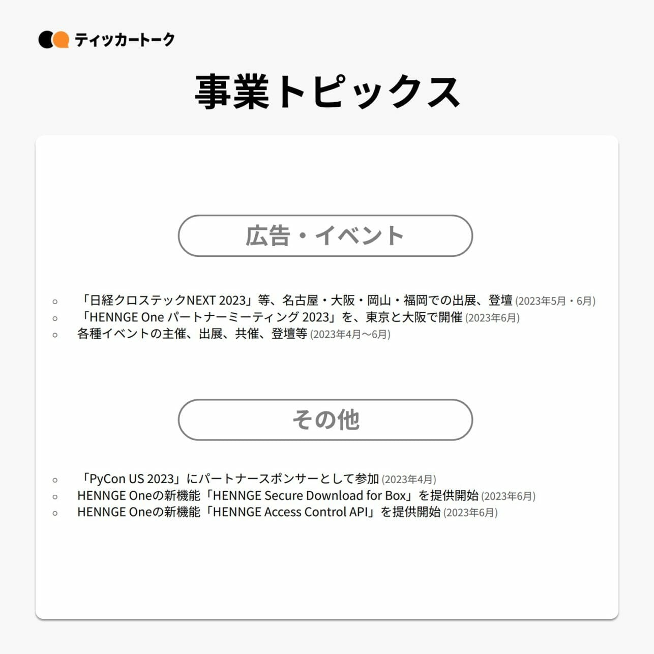 2023年6月、HENNGE Oneの新機能として、「HENNGE Secure Download for BOX」と「HENNGE Access Control API」をリリースしました。 共に、お客様からのニーズが高い分野での新機能となっています。 まだ2023年6月にリリースしたばかりの新機能ですので、今期の業績寄与は限定的ですが、このように、これからもお客様のニーズをしっかりと捉え、お客様に提供できる価値を増やし続けていきたいと考えています。