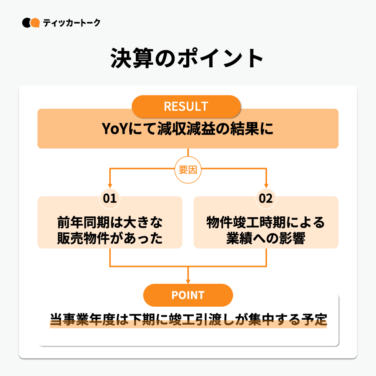 Q1は前年同期に比べ大幅な減収減益となりました。例年、Q1は販売物件が少ない時期となりますが、前年同期は大きな販売物件があり、例年とは異なる業績推移となっております。当社の事業は物件竣工時期による業績への影響が大きく、当事業年度においては特に下期に竣工引渡しが集中する予定となっております。
