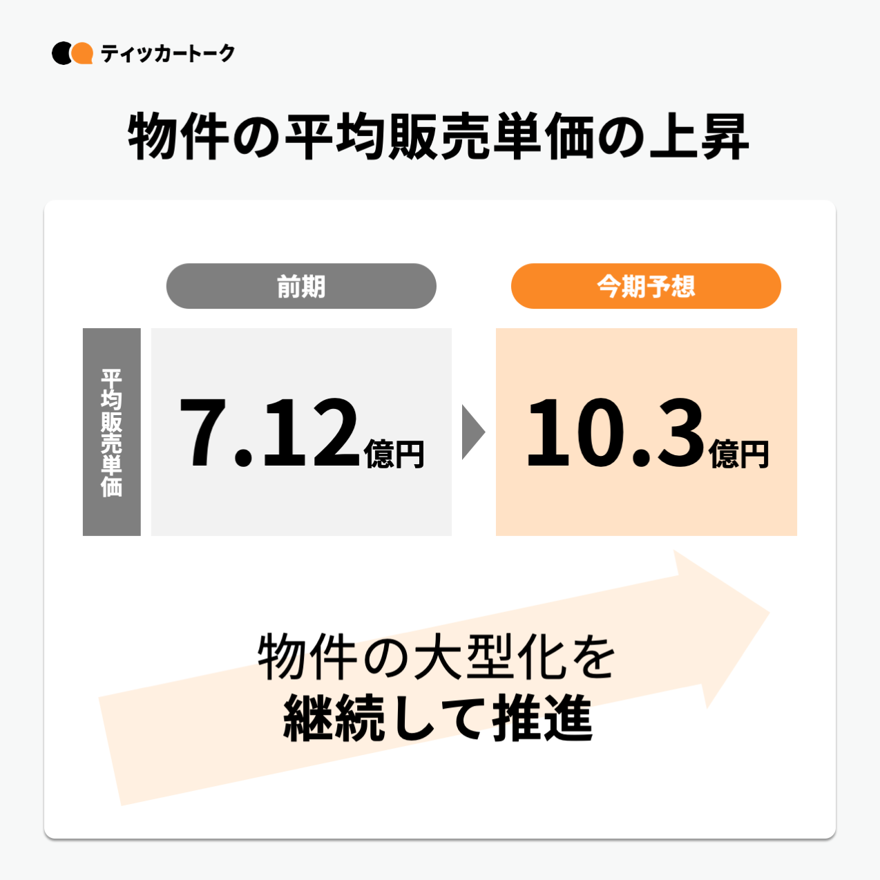 物件の大型化は中期経営計画の重点戦略の一つとして掲げております。 前期の平均販売単価が7.12億円、今期の平均販売単価の予想が10.3億円となっており、継続して推進してまいります。