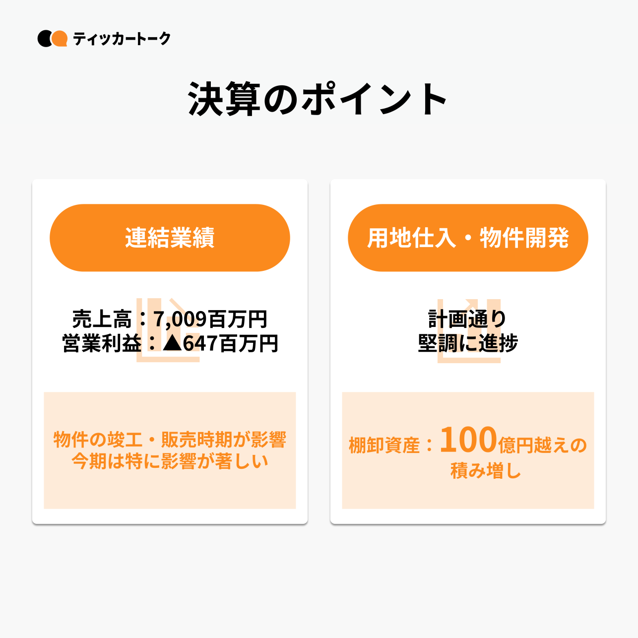 2024年3月期第3四半期は不動産商品3件、建築商品5件の販売となり、売上高は70億9百万円、営業損失が6億47百万円となりました。前年同期の個別決算と比較して売上高・営業利益ともに減収減益となっておりますが、これは物件の竣工・販売時期が大きく影響しております。当社業績は売上・利益が4Qに偏重する傾向にあり、特に今期はその傾向が顕著になっています。用地仕入・物件開発は堅調に進捗しており、棚卸資産は100億円超の積み増しが出来ておりますので、概ね計画通り進捗しています。なお、株式会社岩本組の子会社化に伴い、当第3四半期よりP/Lの連結決算取り込みを開始いたしましたので、前年同期との比較は参考数値となります。