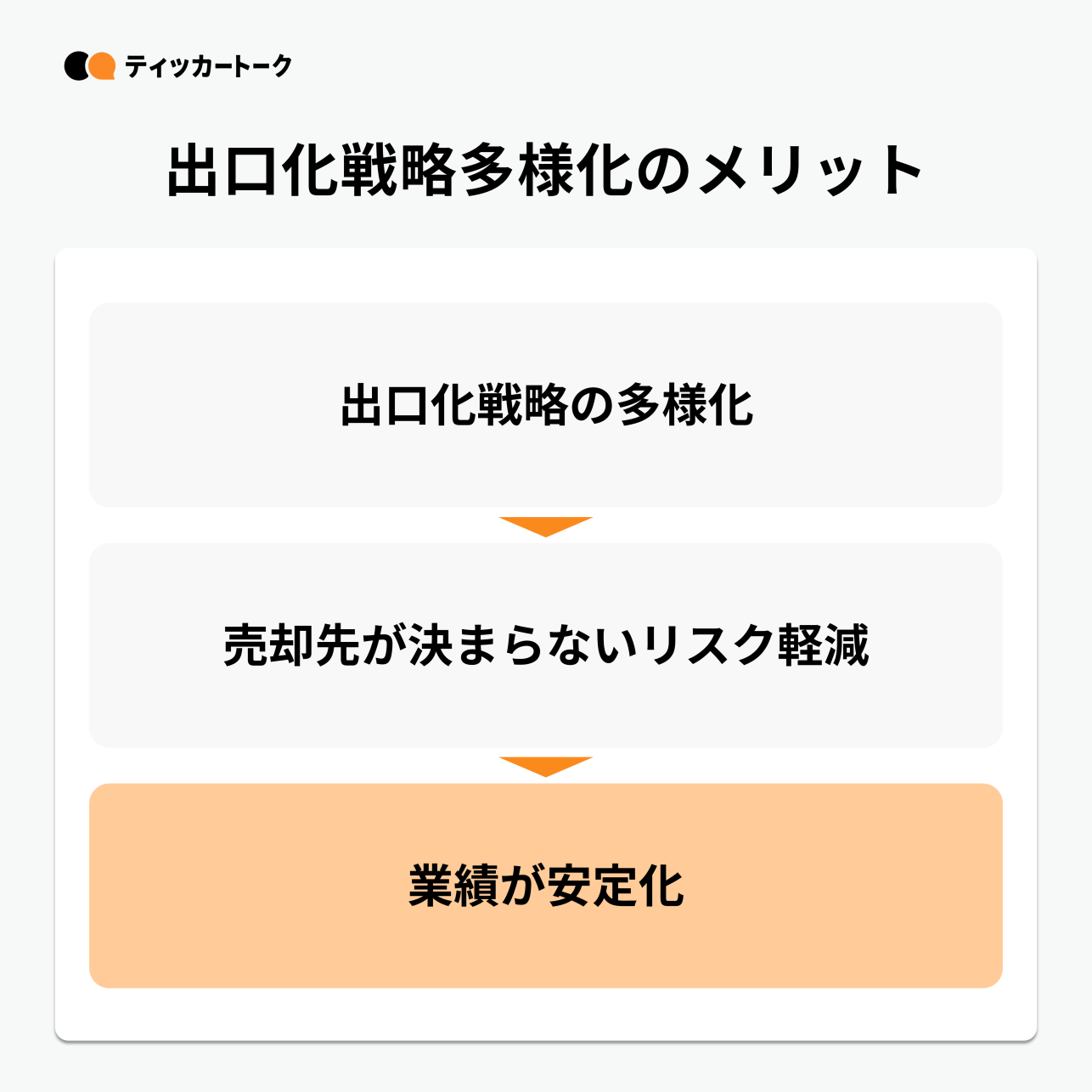 出口化戦略を多様化することで、売却先が決まらないリスクが軽減され、業績の安定化が見込めます。
