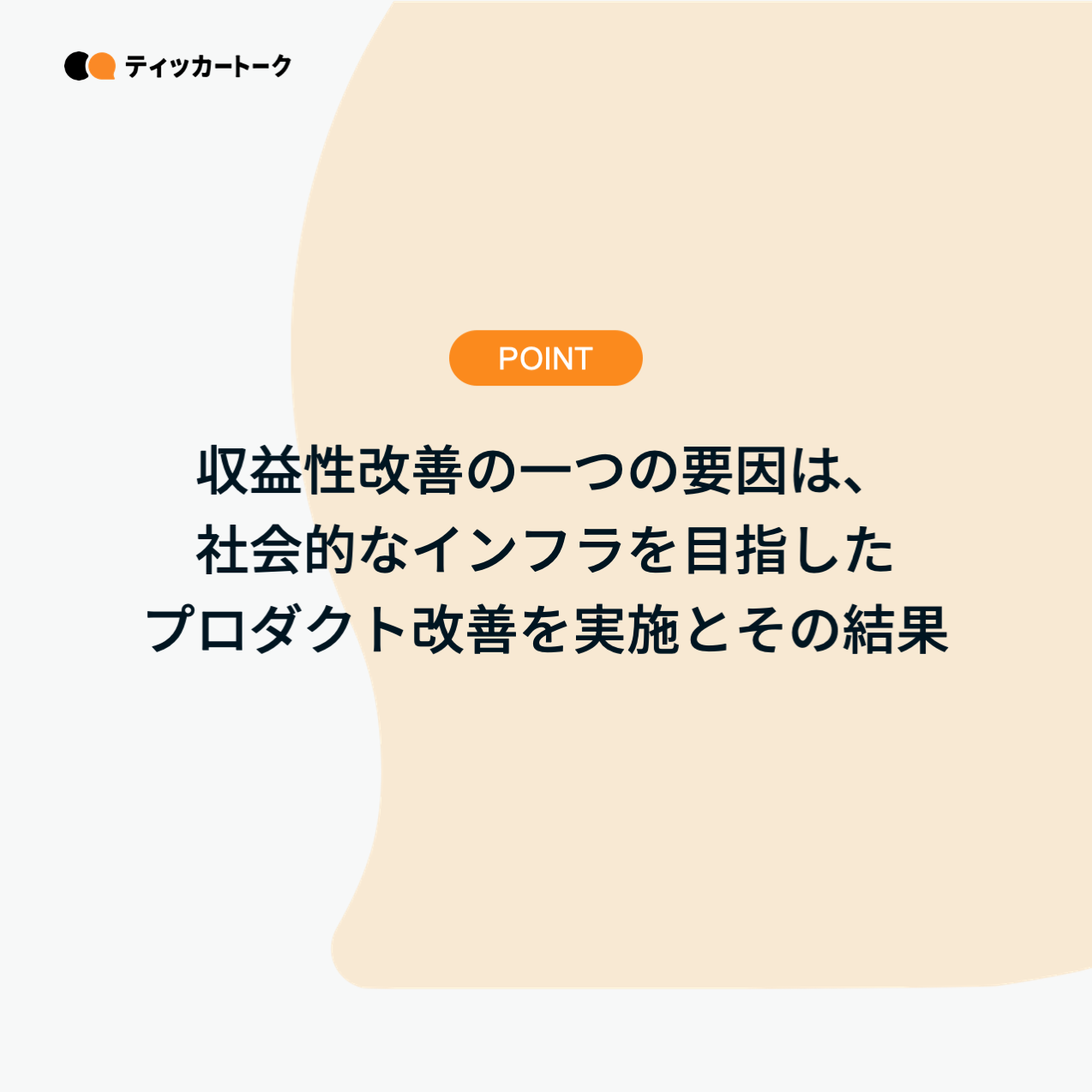 先ほどのプロダクト改善と合わせてプロモの形も変えることによって、今までよりもメディア自体の品質を評価するユーザーが利用するようになり、継続率等が過去よりも良い数値が出るようになっています。この2点が収益性改善の大きな背景となります。
