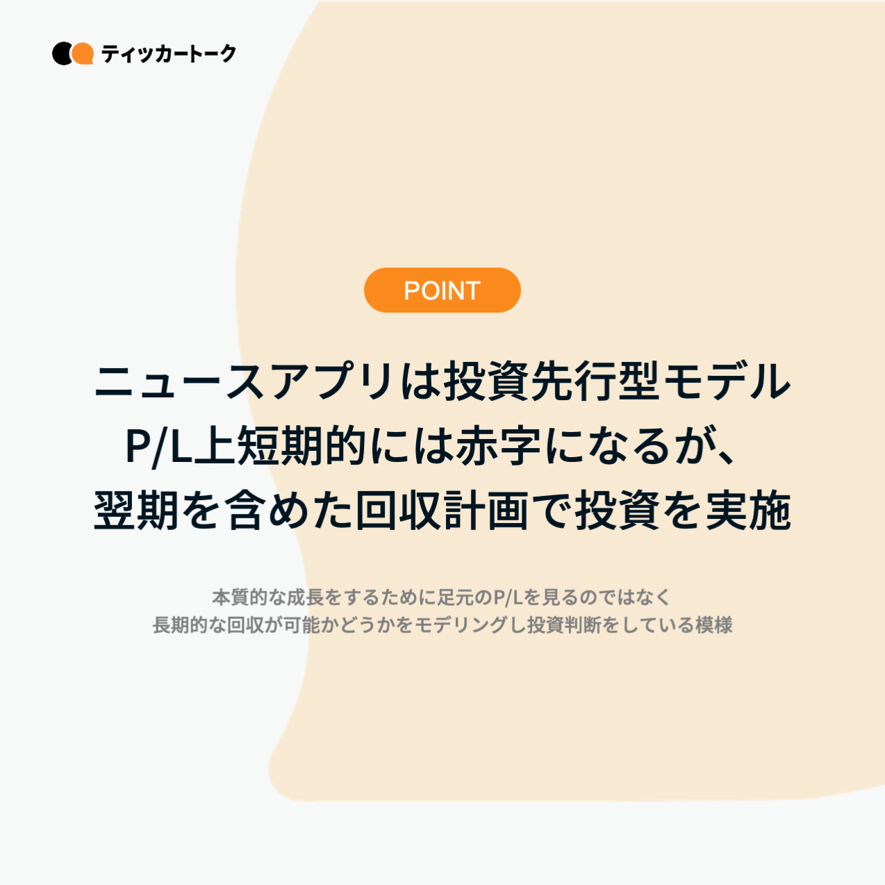これはニュースアプリの性質上どうしても投資先行型のモデルになるので、ユーザー数を成長させようと思うと広告宣伝費を踏まざるを得ない状況にあります。1年などの短期間のPLではなくて、翌期も含めた回収期間で見ておく必要があります。逆にPLが黒字であるかを気にしすぎていると本質的な成長に向けた投資をできなくなります。