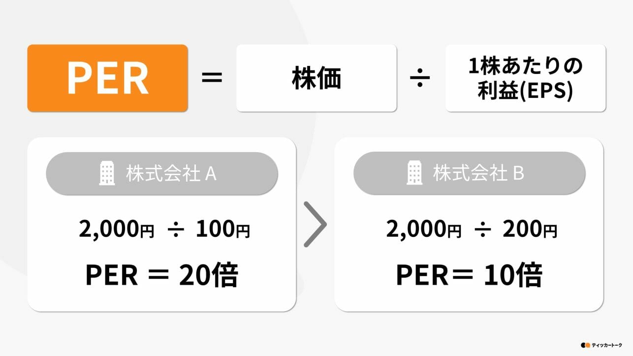 例えばPERの値が20倍のA社と10倍のB社があったとしましょう。A社に投資した場合は20年間で金額を回収できるのに対し、B社であれば10年間で全額を回収できます。よってB社に投資したほうが良いとわかるのです。