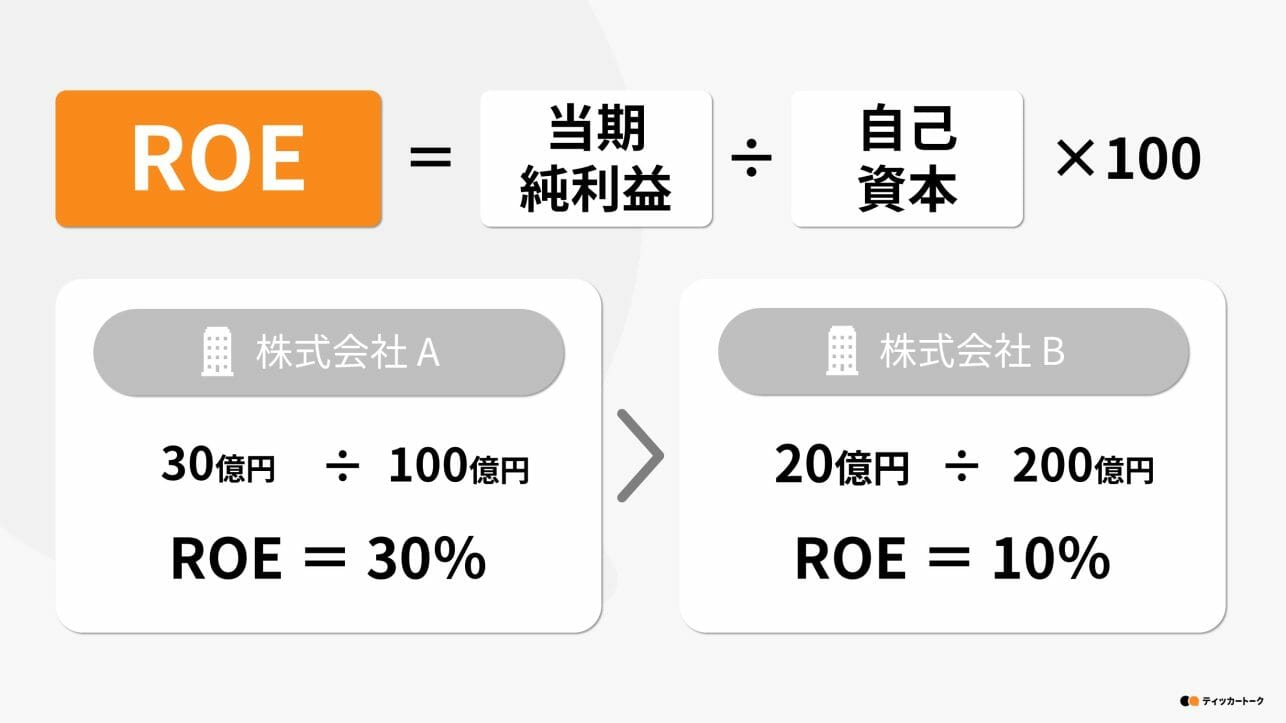 ROEは自己資本利益率という意味で、株主が企業に投資した金額に対して生じた利益率を示す値です。算出するには「当期純利益 ÷ 自己資本 × 100」の式を用います。