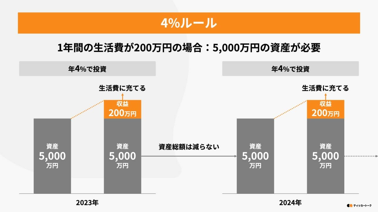 例えば、資産が5,000万円の場合は年4%で投資することで、200万円の収益が入ります。この200万円を超えない範囲で生活費に充てれば、資産総額を減らさずに生活ができます。