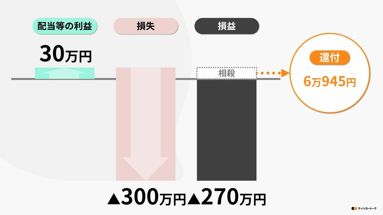 上記の条件で損益通算を行うと「300万円ー30万円」となり、残りは損失の270万円となります。30万円の利益が相殺されているため、源泉徴収されている「6万945円」の税金が還付されます。