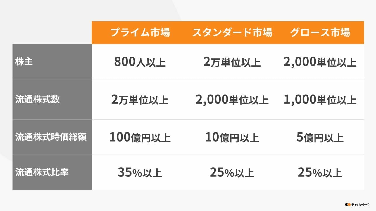 プライム市場と他の2種類の市場とでは、以下のように上場の基準や基本的な理念に複数の差があります。