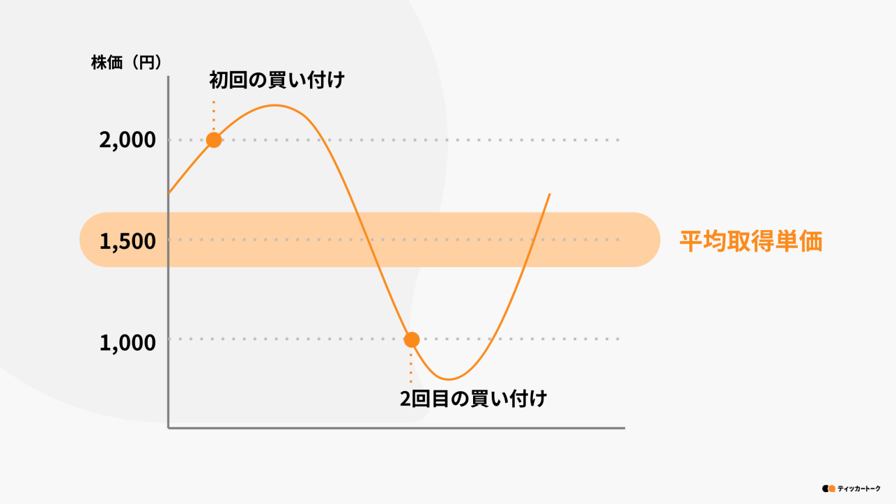 一度目の買い付けで2,000円であった取得単価が、株価下落時にナンピン買いを行ったことで取得単価が平均化され、1,500円まで下がっています。