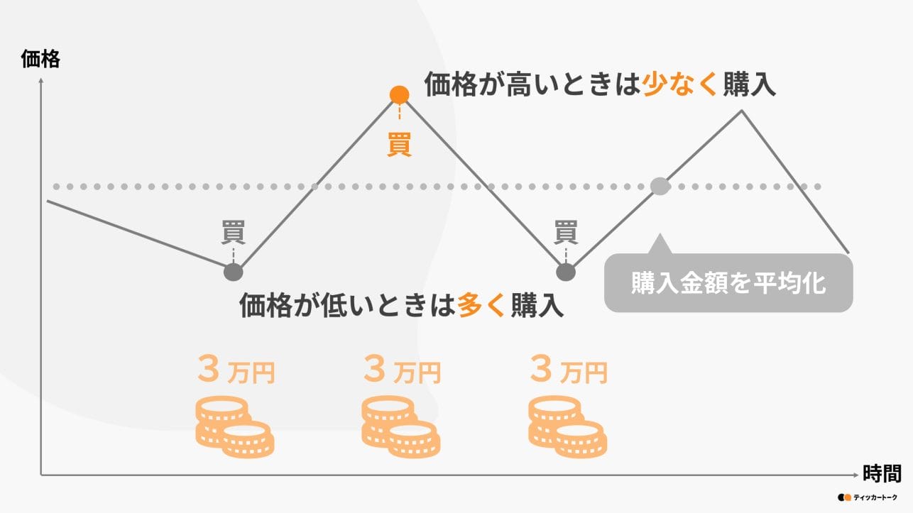 また、ドルコスト平均法では、価格が高いときには少ない数量を、価格が低いときには多くの数量を購入するため、購入単価が一定でなく、時間とともに平均価格が安定します。価格の平均化により、市場が大きく変動しても、ポートフォリオ全体の価値が安定し、急激な損失を軽減できます。