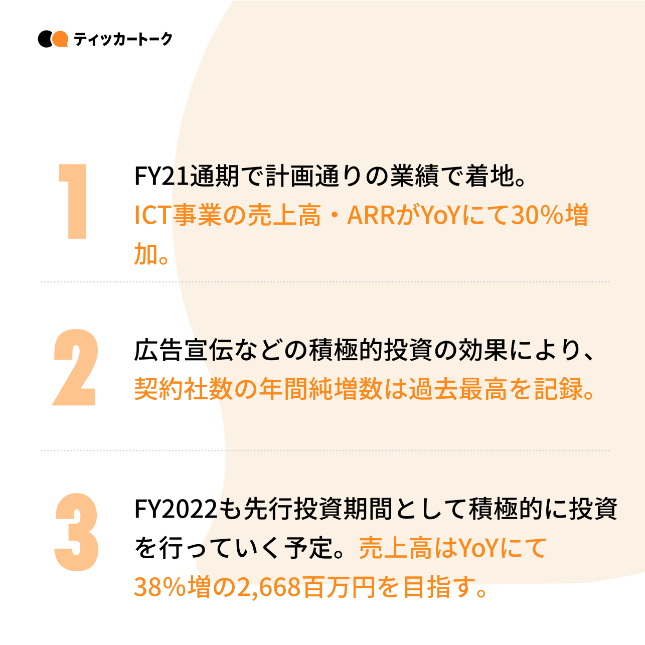 FY21通期を通して計画通りの業績を達成しました。各主要KPIの成長しており、今後成長速度の加速も期待できます。来期も人材投資をメインとした事業拡大への積極的投資を行っていく予定であり、中長期目線で成長を見守りたい企業です。