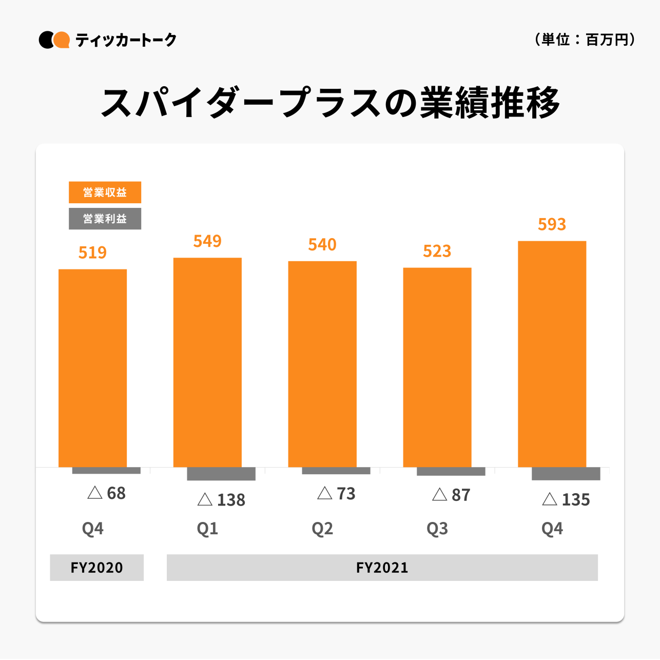スパイダープラスは2022年2月10日、2021年12月期通期決算を発表した。売上高は11.8%増の2,206百万円、営業利益は▲433百万円となった。