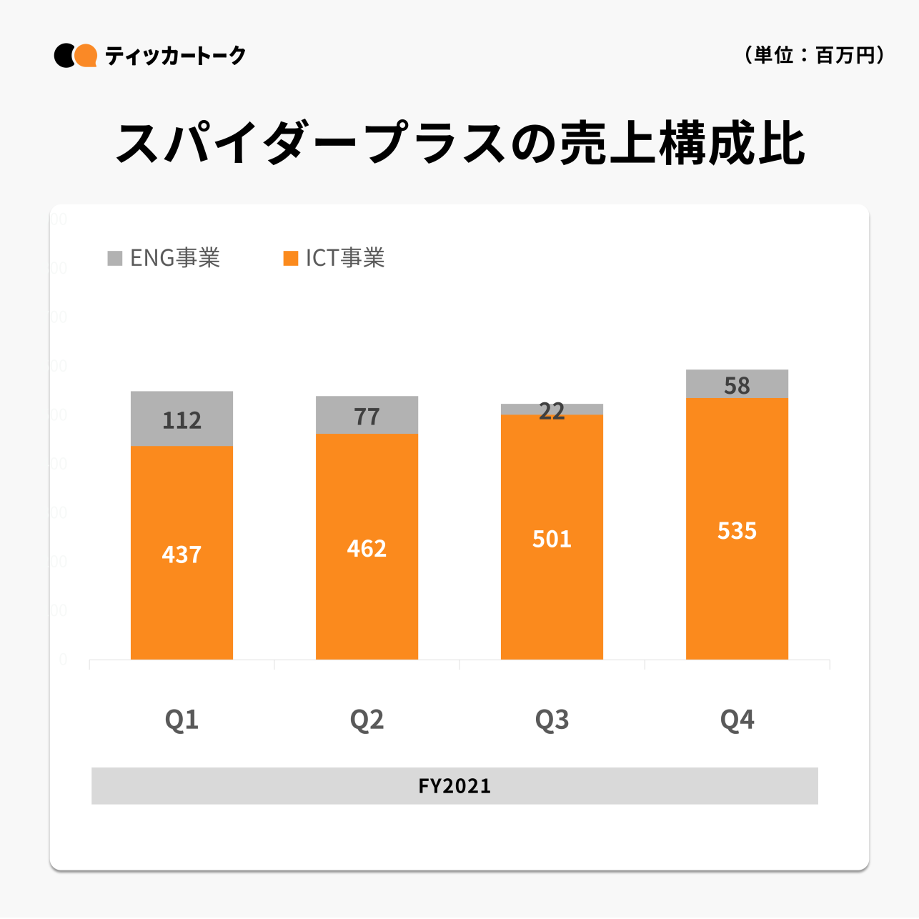 スパイダープラスはメイン事業のICT事業とENG事業の2事業を展開しているが、ENG事業は2022年1月に事業譲渡を実施しており、メイン事業のICT事業が売上高のほとんどの割合を占めている。ICT事業の売上高はFY2021Q4単体では535百万円、累計では1,936百万円となり、事業計画通り30%増の成長を達成した。