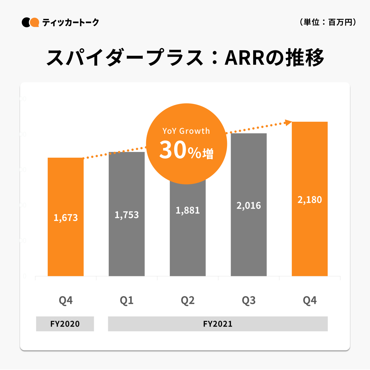 スパイダープラスの各主要KPIが順調に成長を遂げている。ARRの推移は2,180となり、事業計画通りのYoYにて30%の増加を達成した。