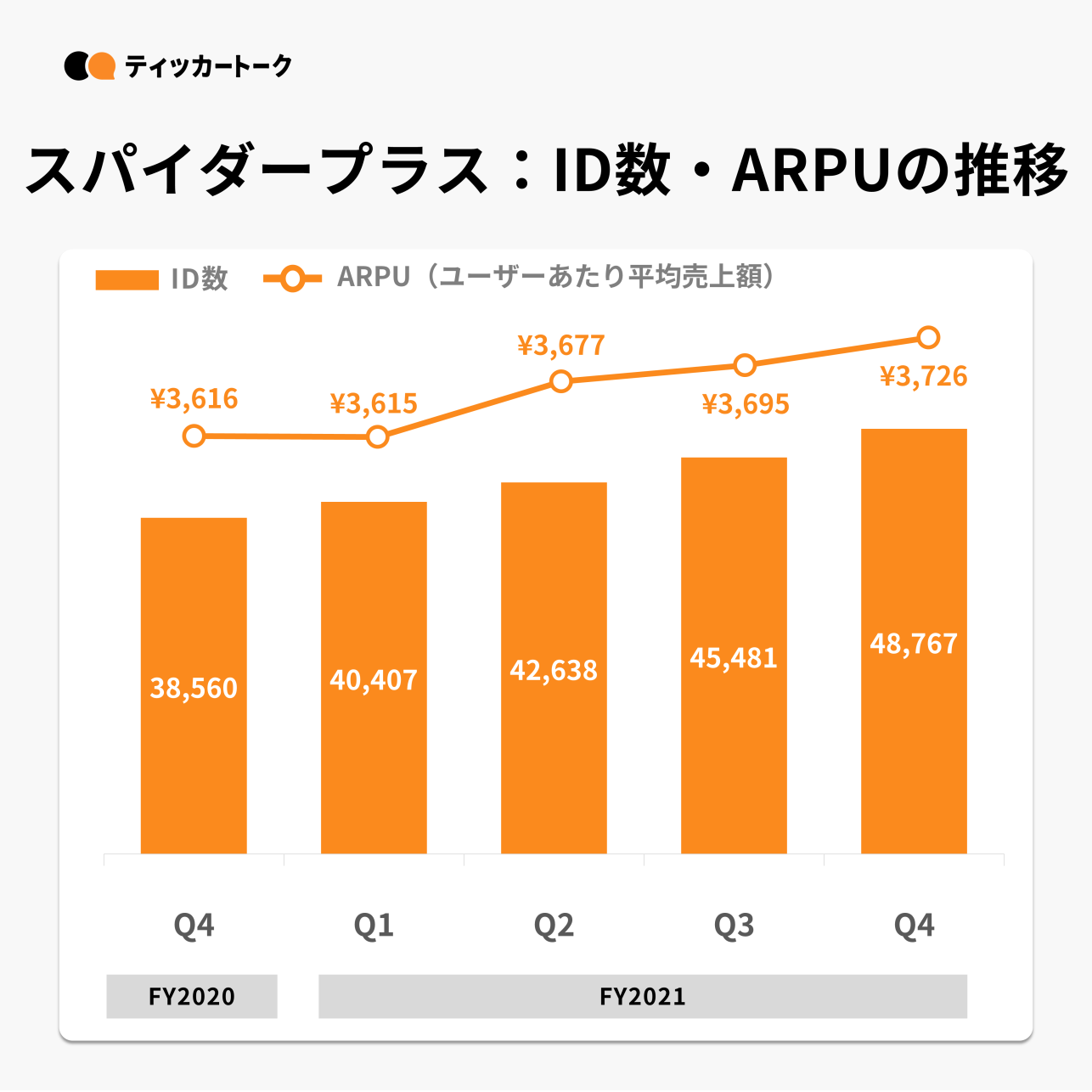 ID数とARPUも順調な成長を見せている。ID数は既存顧客のID数増加が起因し、YoYにて26.0%増+3,286IDとなった。ARPUはYoYにて3.0%増の3,726円となり、FY2021通期で堅実に成長を遂げている。