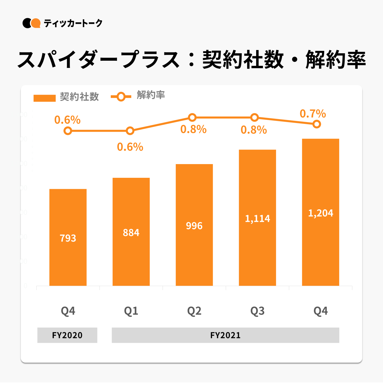 契約社数が飛躍的な成長を遂げている。広告宣伝への積極的投資が大きく貢献し、YoYにて52%増加の1,204社となった。年間での契約社数が400社越えとなり、過去最高の実績となる。併せて解約率も1.0%以下をキープ。継続率も安定し、顧客基盤が拡大している。