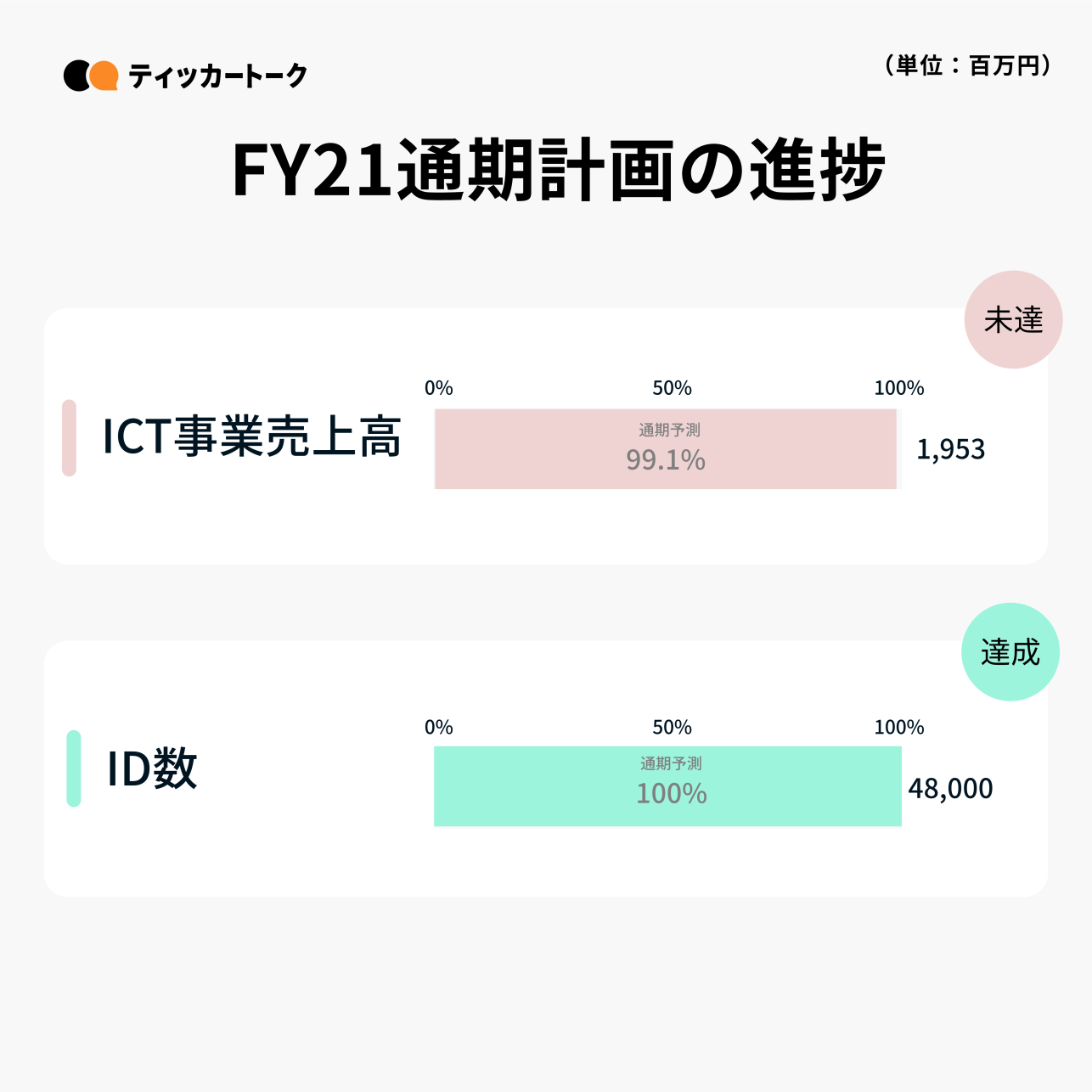 FY2021通期でICT事業売上高を1,953百万円、ID数を48,000IDとしていた。ICT事業売上高の実績は1,936百万円であり、計画地に対してわずかに未達となったが、概ね計画通りの水準で着地した。ID数は顧客基盤の拡大、既存顧客のID数追加により、計画地を超える48,767IDを達成した。