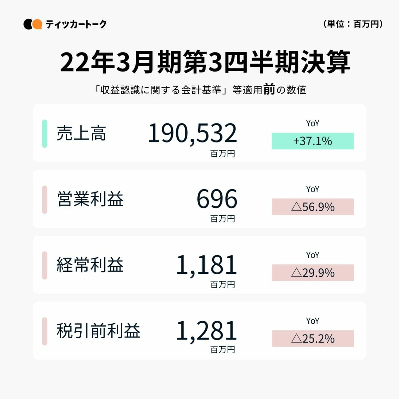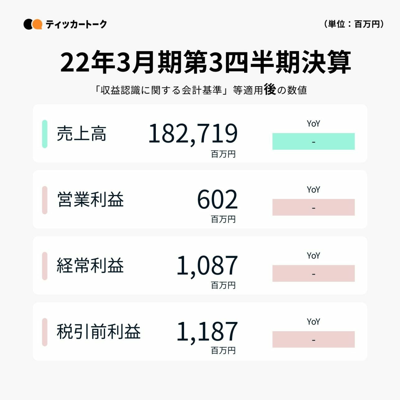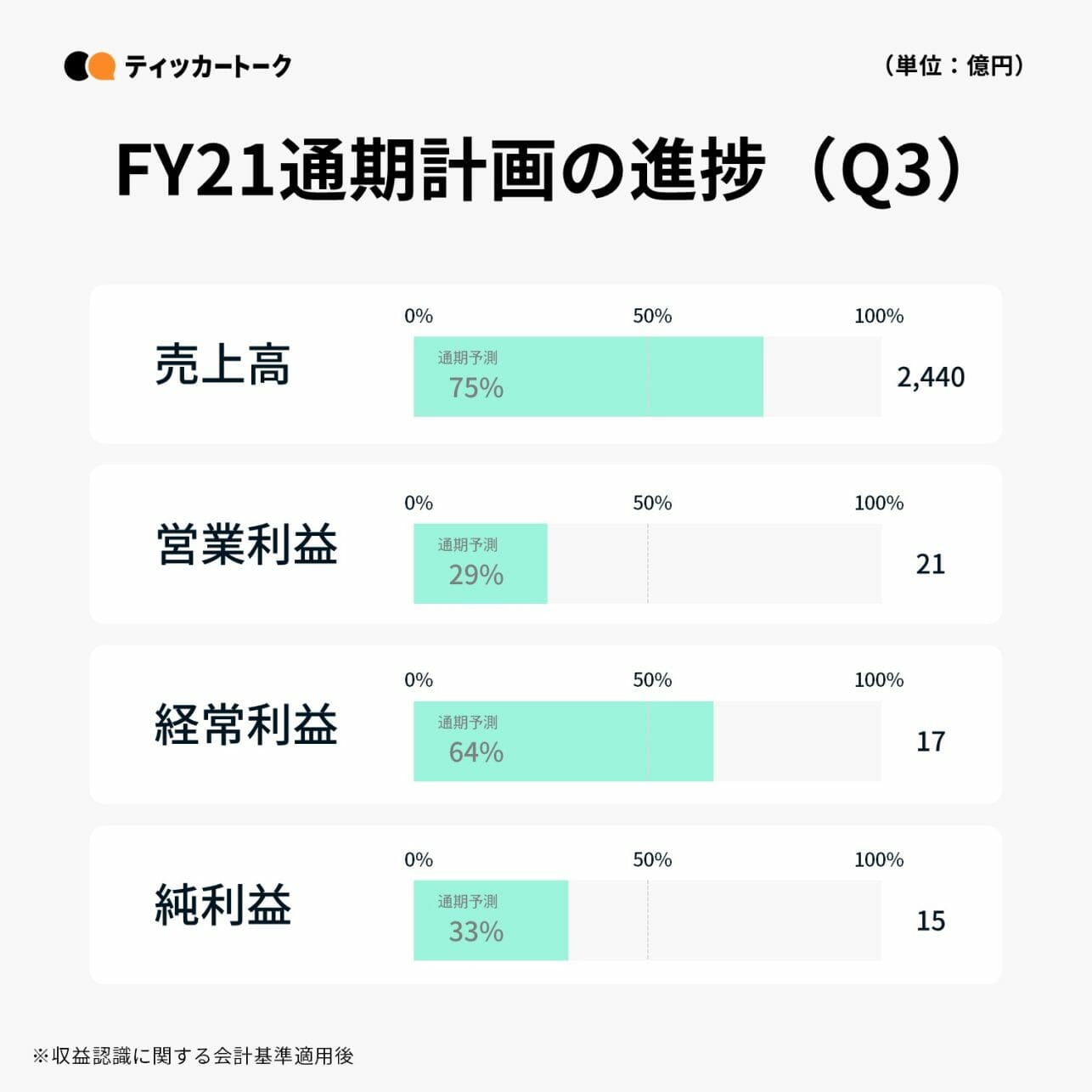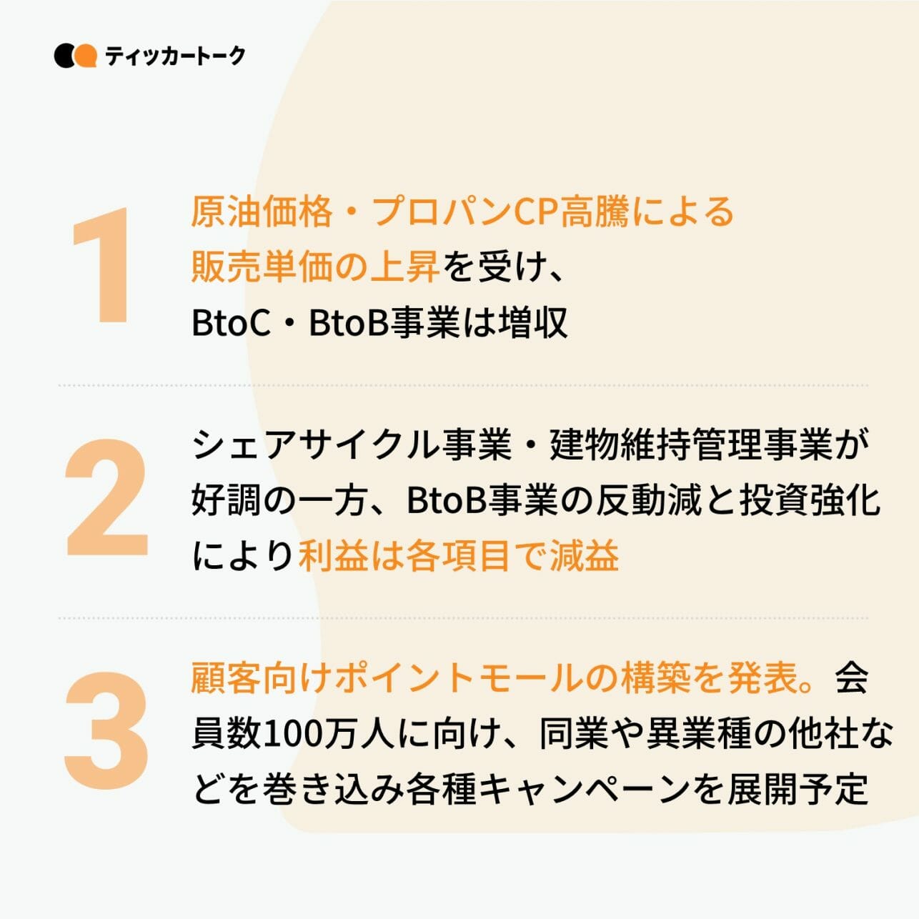 原油やプロパンガスの価格が高騰したことからBtoB/BtoC事業で販売単価が上昇し、収益認識基準適用前の売上高はYoY37.1%増と大幅増収。一方で、投資強化とBtoB事業の反動減により、利益は各項目で減益となった。なお、同社の業績は下期(特にQ4)に利益が偏る傾向にある点に注意。これは、冬にLPガス・灯油の消費量が増えることによるもの。