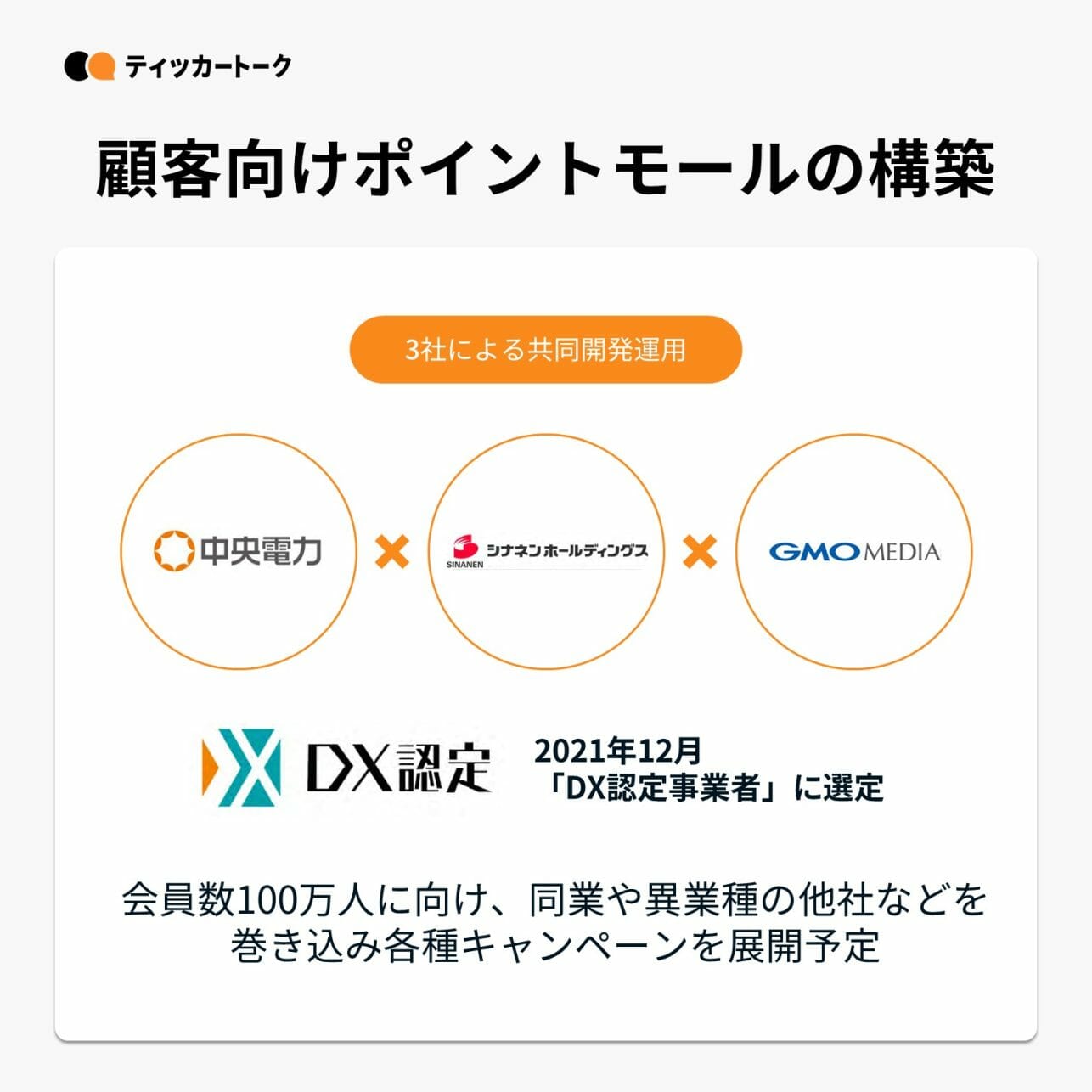 顧客向けポイントモールの構築を発表。中央電力・GMOメディアと3社共同で開発・運用を行っていく。会員数100万人に向けて同業や異業種の他社などを巻き込みながら各種キャンペーンを展開していく予定。