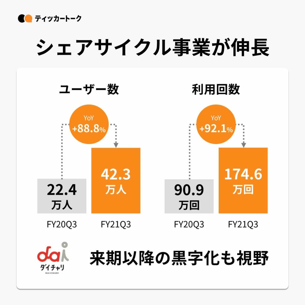 シェアサイクル事業は、ステーション数等の増加で利用が伸び売上高が順調に推移。運営の効率化により赤字幅も縮小し、ユーザー数・利用回数などの各種KPIも過去最高を更新中。来期以降の黒字化が視野に入ってきている。