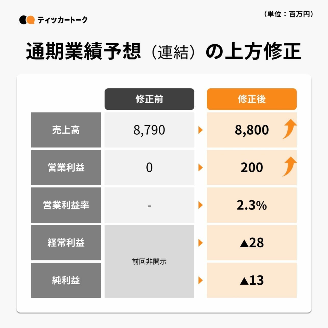 グノシーのKPIが改善していることや、広告宣伝投資を抑えながらも売上高が順調に進捗していることを踏まえ、通期業績予想を上方修正。営業利益は2億円上振れ予想となっている。