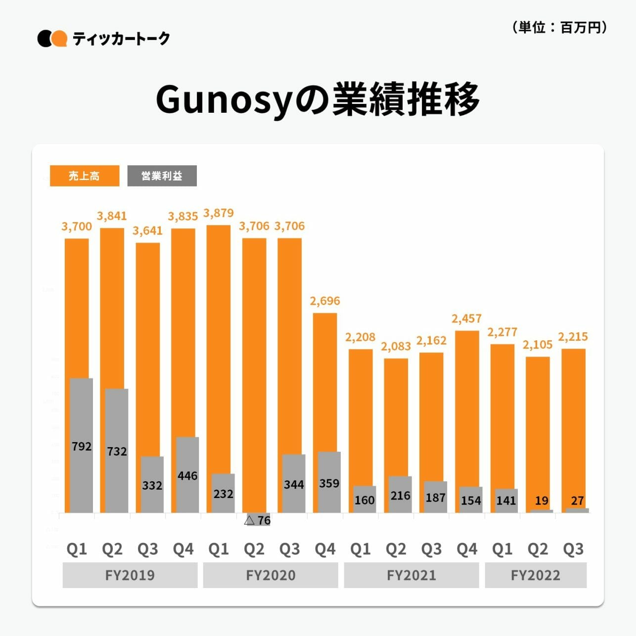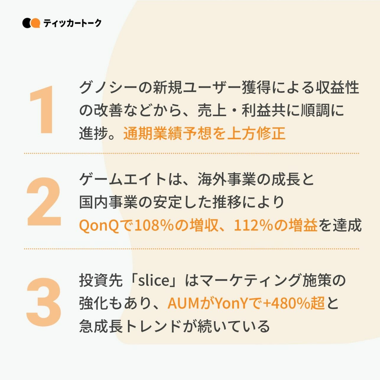 グノシーの新規ユーザー獲得によるユーザーあたり収益性の改善や、前Qで一時的に減収したゲームエイトの売上回復により、QoQで増収増益。Q3累計では、YoYで増収となった一方で広告宣伝費を前年から6.8億円増加させたため営業利益は減益となっている。