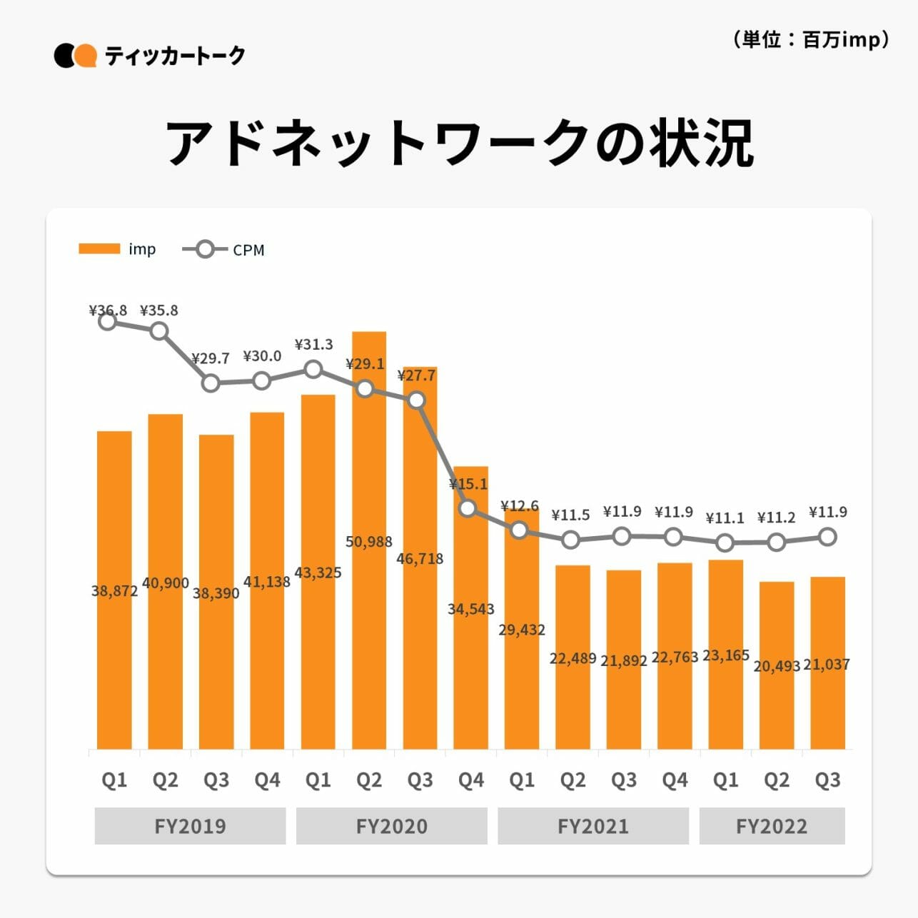 アドネットワークについては、組織強化によりメディア開拓が進み、CPM、impともに回復基調となりQoQで増収。 顧客開拓を引き続き実施し事業成長を推進する。