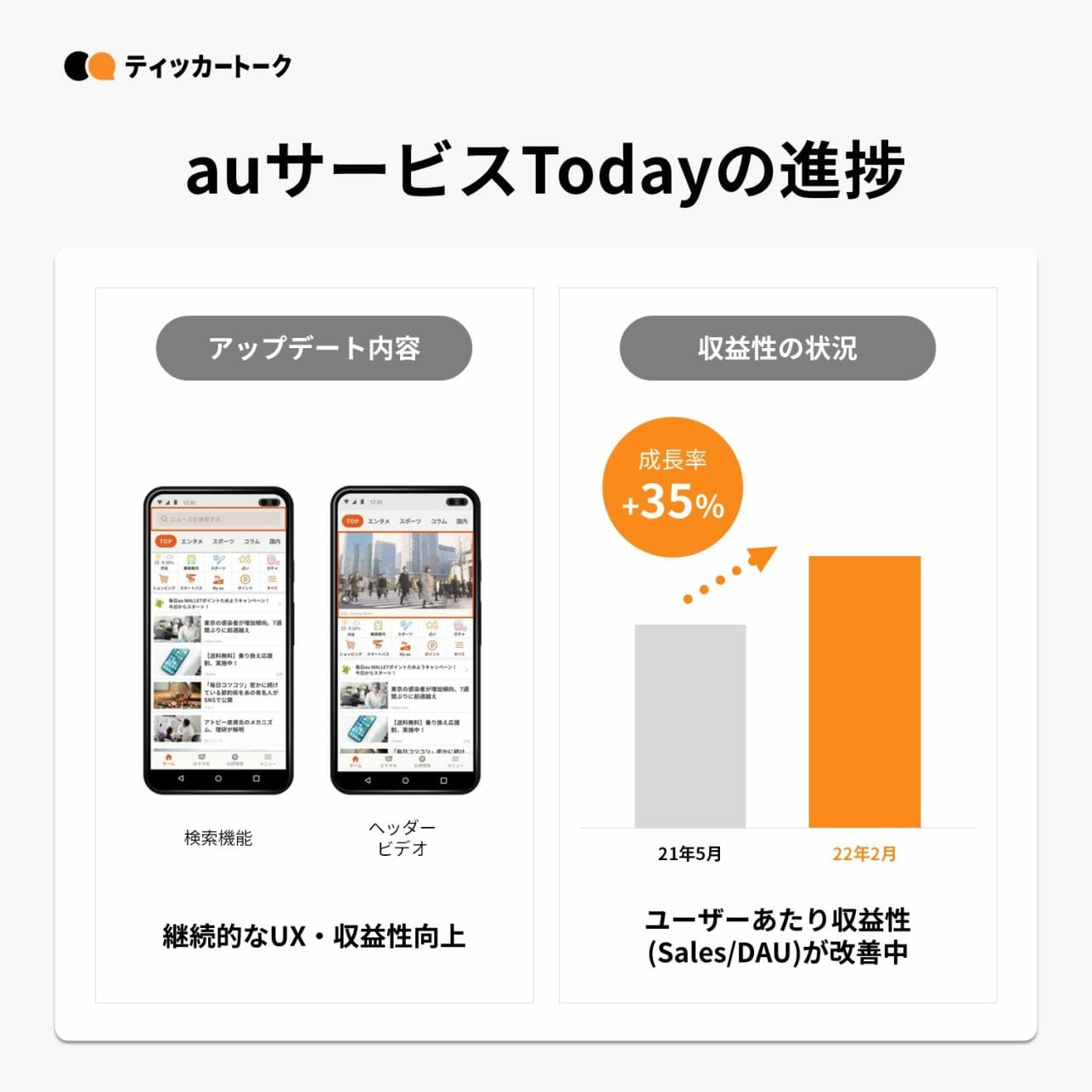 新たに検索機能とヘッダービデオをリリース。それぞれUXの向上、収益性の向上に寄与する見込み。ユーザーあたり収益性(Sales/DAU)は21年5月対比で22年2月の成長率35%と、引き続き改善中。