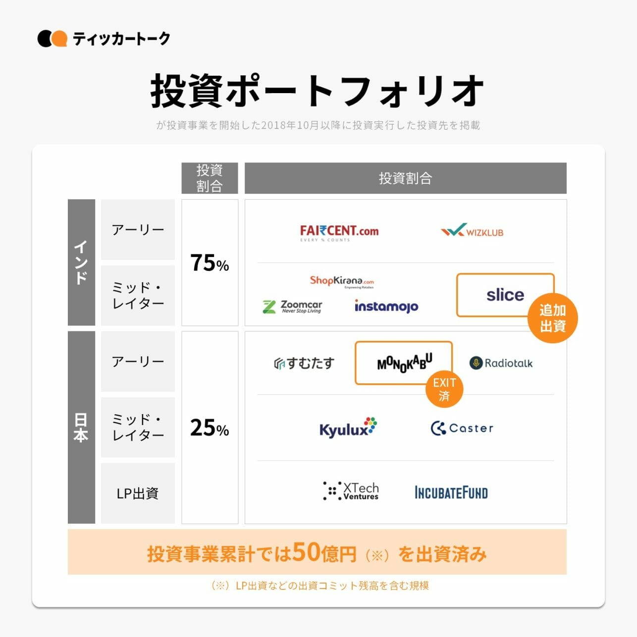 「slice」に関しては、Q2末時点での17%超の持分に加えてQ3で約$10mnの追加出資を実行。累積投資額は約30億円まで増加している。また、投資事業累計では約50億円を出資済。出資額の75%はインド企業となっている。