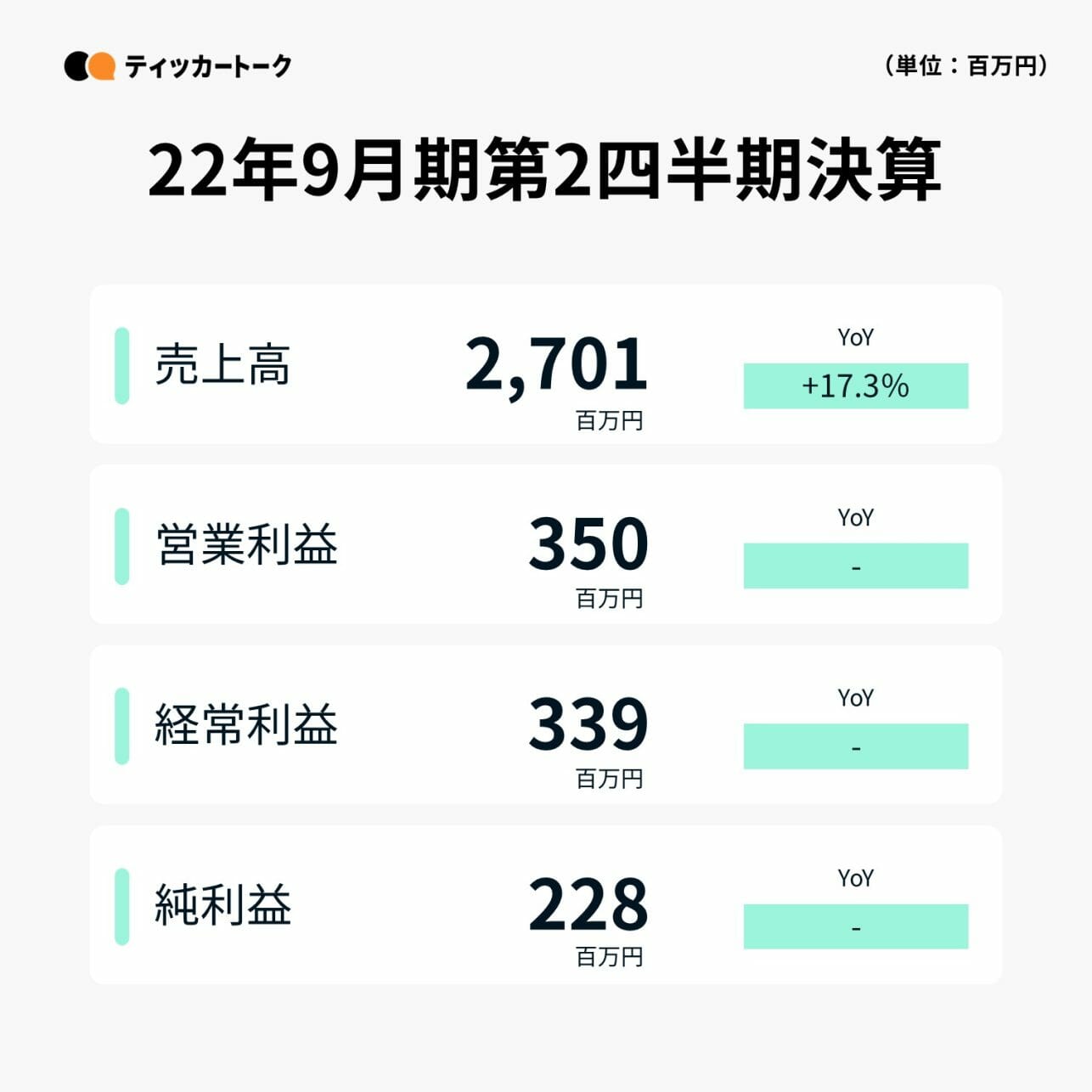 成長ドライバーであるHENNGE Oneの販売が順調に推移したことで売上はQ1-Q2計でYoY17.3%増加。前年同期のような大型のデジタルイベント等を実施しておらず、広告宣伝費が前年同期に比べ減少したことにより営業利益は黒字化している。