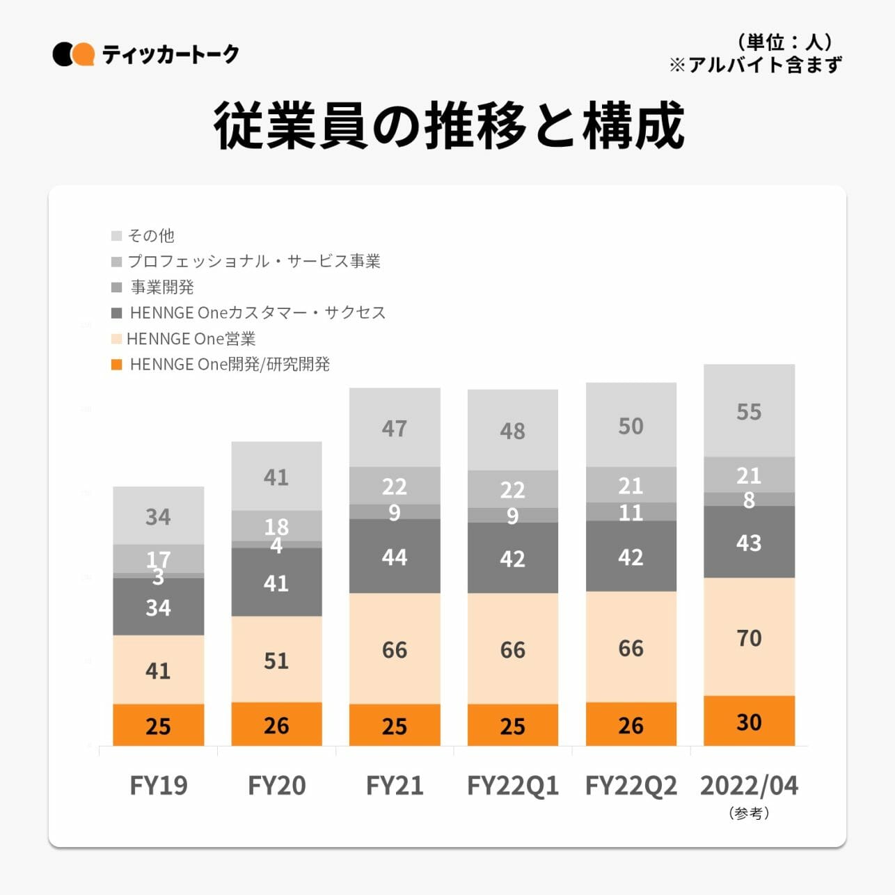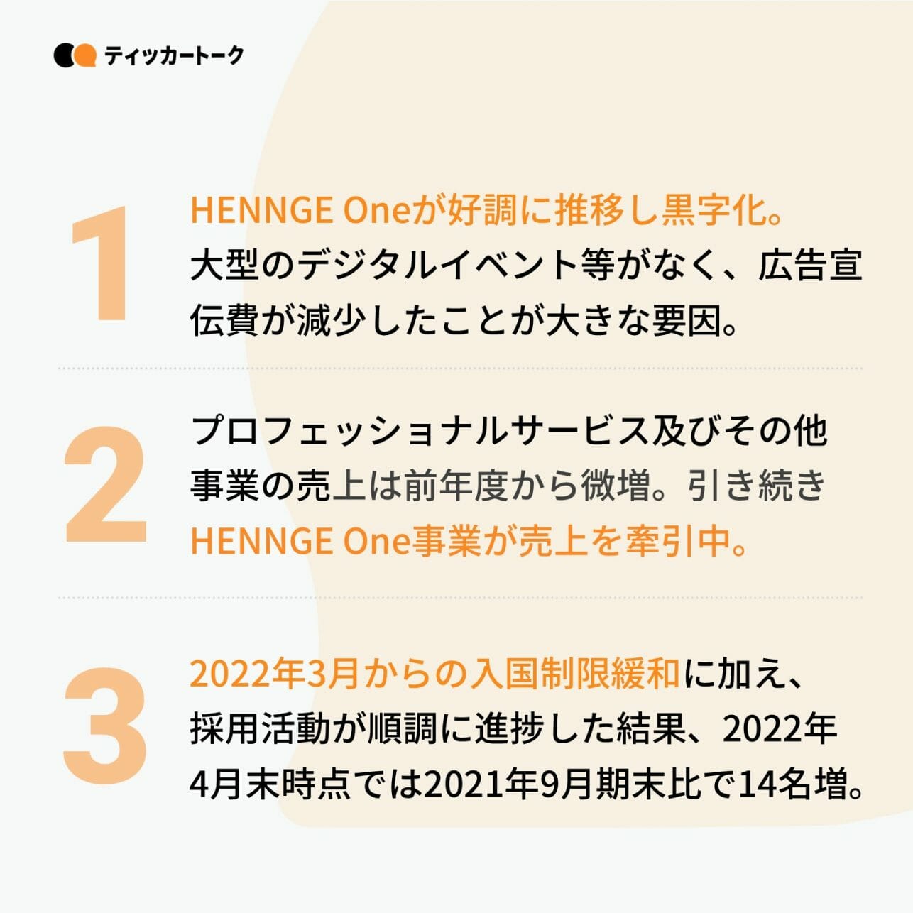 2022年3月より入国制限が徐々に緩和されたことで、HENNGE One開発/研究開発人員を中心に、海外在住内定者が4月以降順次入社。加えて採用活動が順調に進捗した結果、2022年4月末時点では、2021年9月期末比で14名増となった。