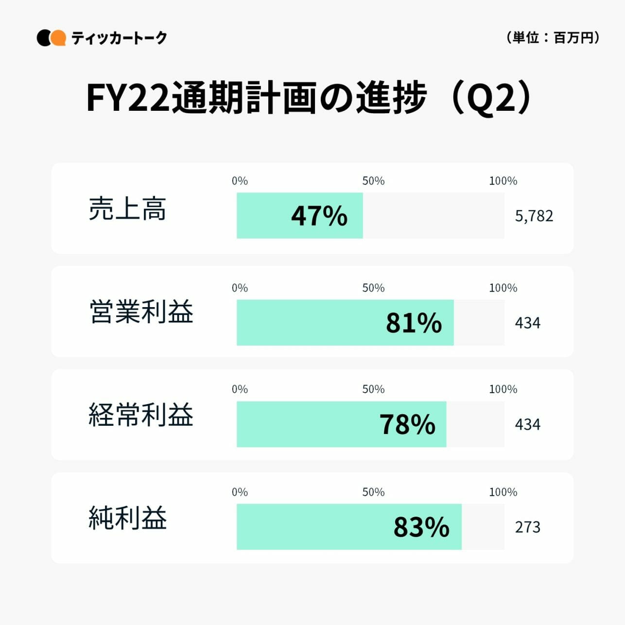 通期計画に対しては、Q2時点ながら利益では各項目で50%を大きく超える進捗となっている。