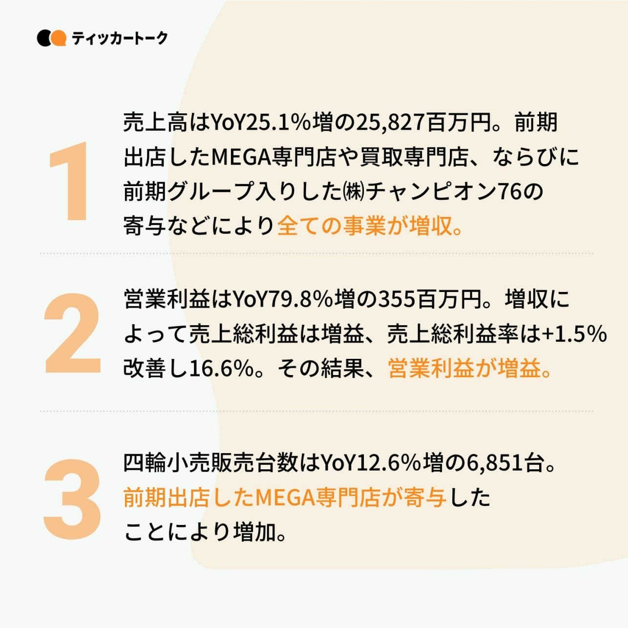 前期に出店したMEGA専門店や買取専門店ならびに前期グループ入りした株式会社チャンピオン76が寄与したことなどによって全ての事業が増収営業利益も増益となった