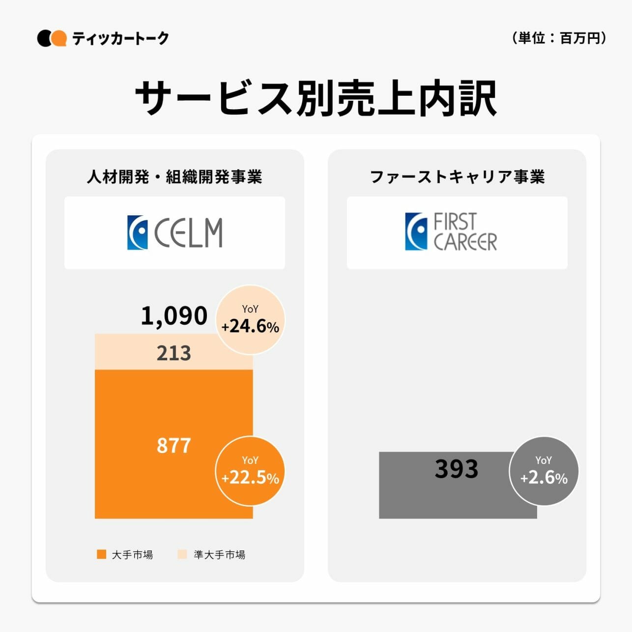 人材開発・組織開発事業は、大手/準大手市場共に前年対比20%以上と順調に成長。ファーストキャリア事業では、同事業の四半期売上過去最高を達成し、こちらも堅調に推移している。