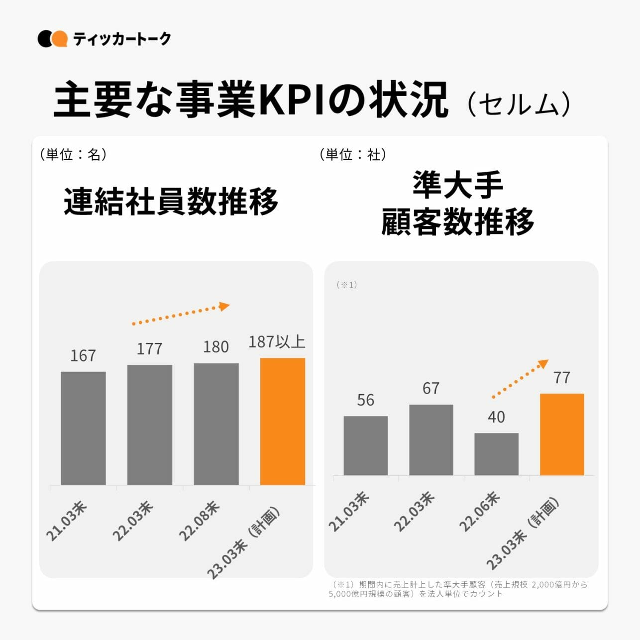 連結社員数は前期末より3名純増の180名。準大手顧客はQ1時点で順調に顧客の深堀/新規開拓を実行、計画通りの進捗となっている。「経営塾の実施社数」「人事以外の事業部門への展開」の23.03末着地見通しは変わらずであり、Q2以降に再確認予定。