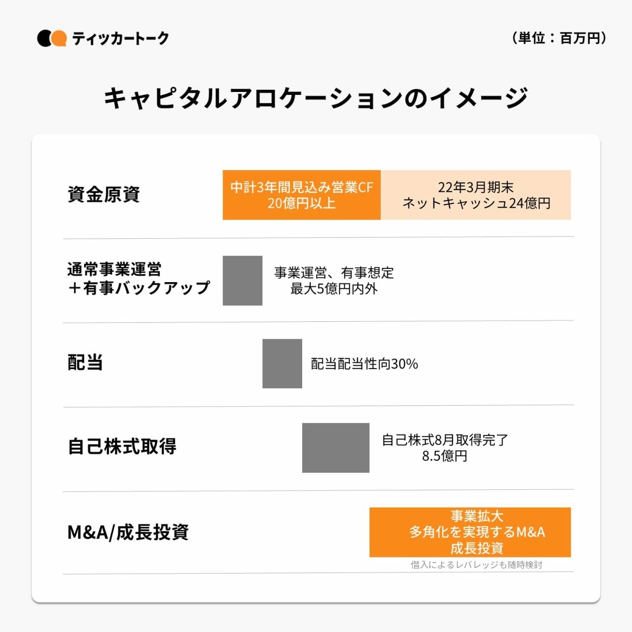 今後の資本政策方針として、M&Aを含む戦略的投資を優先的に実行し企業価値向上を目指す方針を公表。