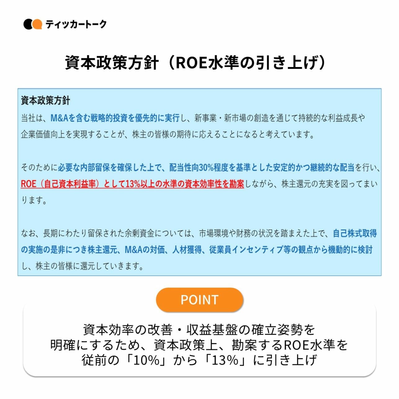 必要な内部留保を確保した上で、配当性向30%程度を基準とした安定的かつ継続的な配当を行い、ROE(自己資本利益率)として13%以上の水準の資本効率性を勘案しながら株主還元の充実を図る旨を発表している。