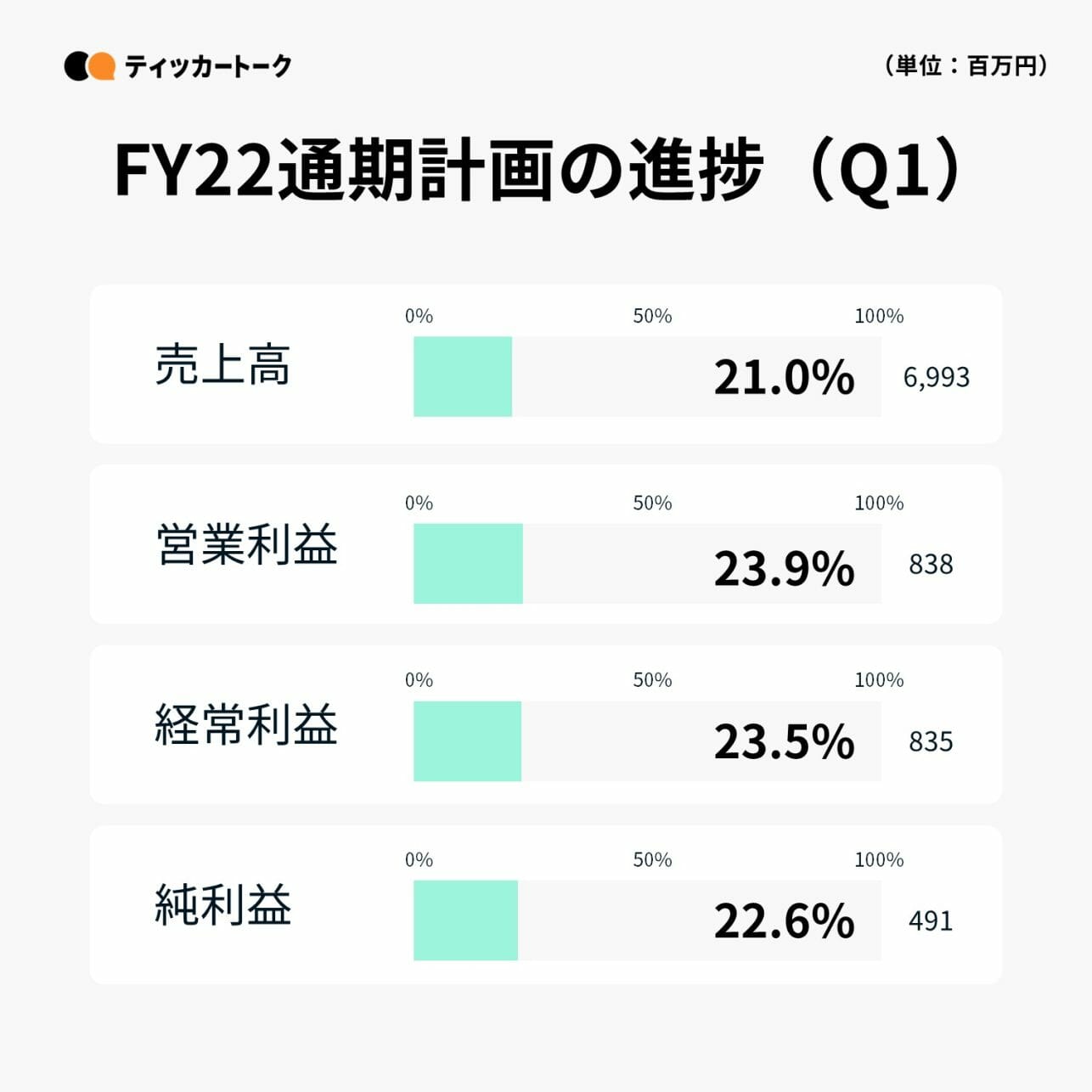 季節要因により、年間の中でもQ1業績は相対的に落ち着く中、昨年を上回る進捗にて順調に推移。売上高、各段階利益共に通期業績予想に対し、計画通りの進捗となっている。