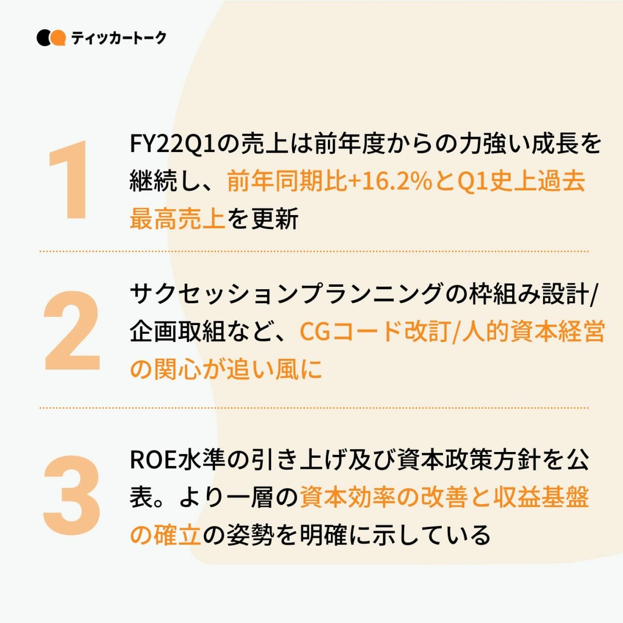 FY2022 Q1は前年度からの力強い成長を継続し、前年同期比+16.2%とQ1史上過去最高売上高を更新する結果となった。
