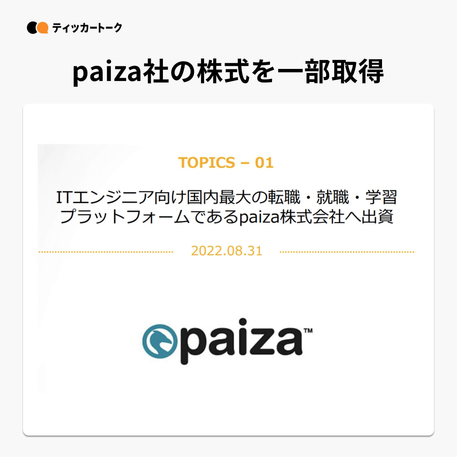 ITエンジニア向け国内最大の転職・就職・学習プラットフォームであるpaiza株式会社の株式を一部取得。 IT人材不足が確実視される将来において、サービスとのシナジー効果を期待している。