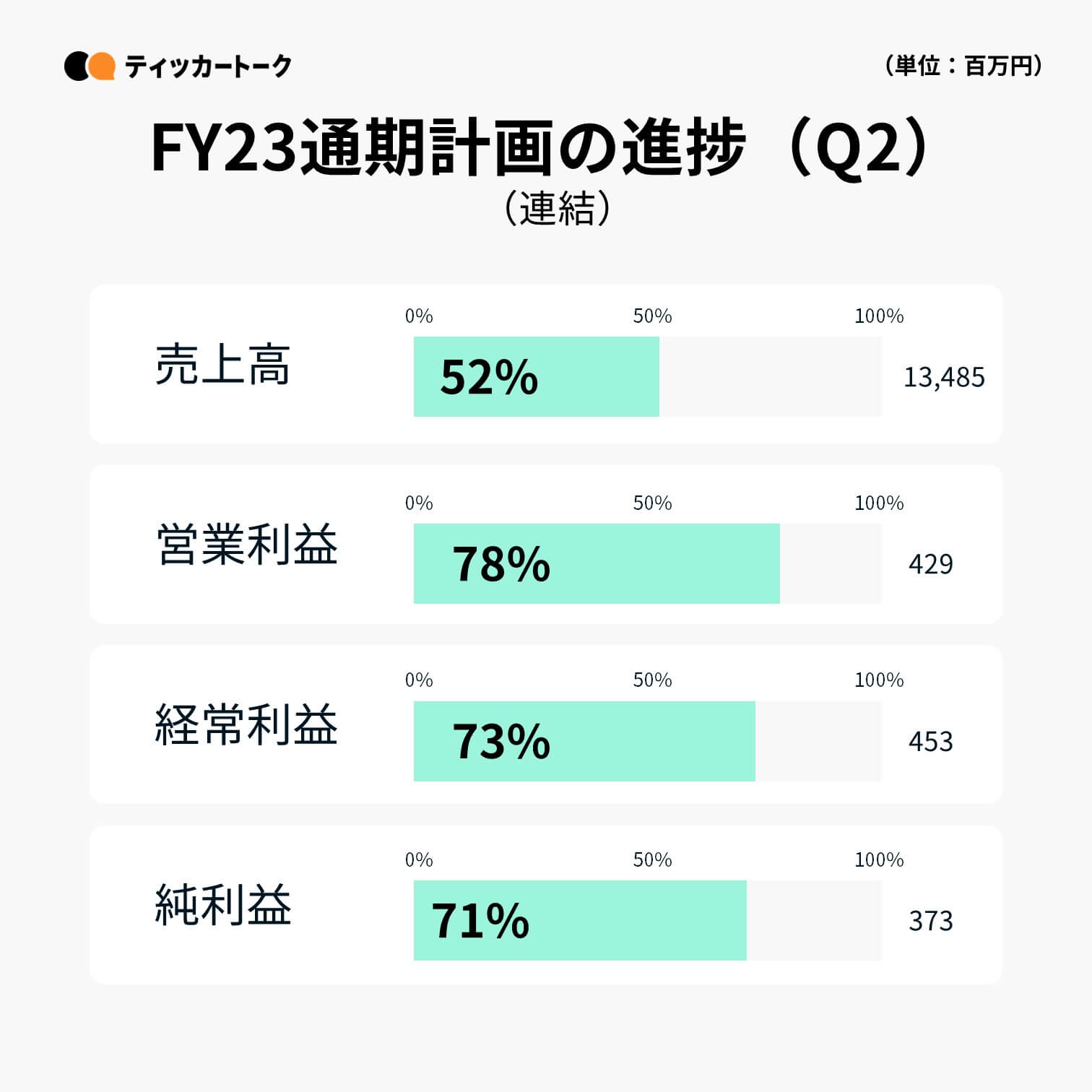 FY23Q2時点での通期計画に対する進捗は、売上高は52%、営業利益は78%と順調な状況。