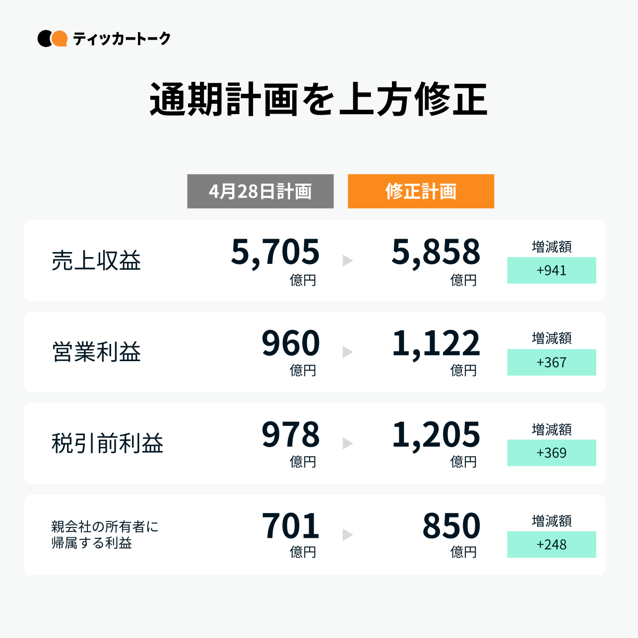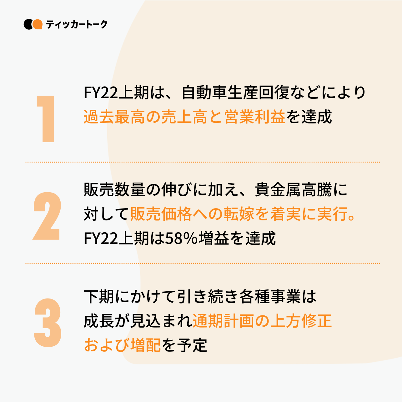 業績好調に伴い、通期計画の上方修正を発表。⾃動⾞⽣産の回復に伴いセンサを中⼼に売上が伸⻑したことや、SPE事業で旺盛な需要を捉えたさらなる事業拡⼤を計画していること、貴⾦属価格⾼騰に対応した値上げを⾏うことで、コストの増加を吸収することなどが背景にある。